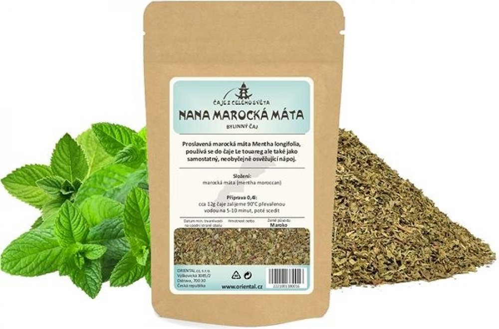 ORIENTAL Nana Marocká máta50 g Svěží s nasládlou chutíTento produkt je sypaný bylinný čaj z listů Marocké máty Nana (Mentha spicata 'Moroccan'), která je proslulá svou výjimečně svěží a jemně nasládlou chutí bez peprné hořkosti běžné máty. Máta Nana je tradiční a nepostradatelnou ingrediencí pro přípravu marockého čaje "Le Touareg". Čaj se pije horký pro uklidnění a povzbuzení, ale je také ideální pro přípravu neobyčejně osvěžujícího ledového čaje v teplém počasí. Balení představuje čistý bylinný nápoj, který do vašeho šálku přináší kousek orientální atmosféry. Složení100% Marocká máta Nana. Doporučené dávkováníČaj lze popíjet v průběhu celého dne pro osvěžení nebo po jídle pro podporu trávení. PřípravaPřibližně 10 g přelijte 0,5 litrem vroucí vody (90 °C) , nechte 5-10 minut louhovat. SkladováníSkladujte v suchu při teplotě do 25 °C.