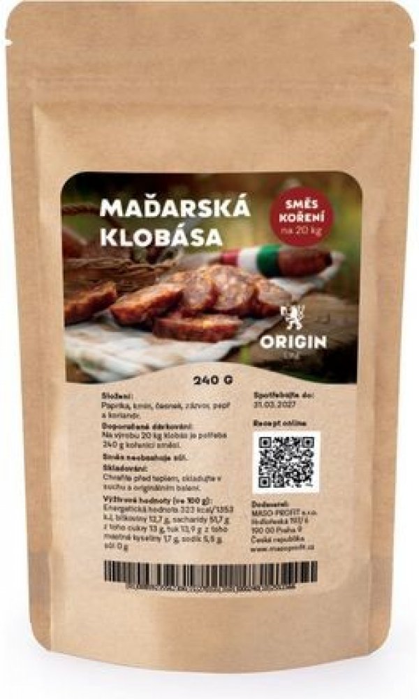 Objevte autentickou chuť maďarské kuchyně s naší přírodní směsí koření od značky Origin Line, navrženou speciálně pro přípravu lahodné Maďarské Klobásy - recept naleznete zde. Tato směs je složena z pečlivě vybraných ingrediencí – paprika, kmín, česnek, zázvor, pepř a koriandr – které společně vytvářejí bohatý a vyvážený chuťový profil.Co dělá naši směs Maďarská Klobása tak jedinečnou?Paprika: Dodává klobásám charakteristickou barvu a sladkou, lehce pálivou chuť, která je základem maďarské kuchyně.Kmín a pepř: Přinášejí výraznou a pikantní chuť, která skvěle doplňuje ostatní ingredience.Koriandr: Dodává jemný citrusový nádech, který zjemňuje pikantnost a doplňuje celkový chuťový profil.Česnek a zázvor: Přidávají klobásám bohaté a aromatické tóny, které zajišťují vyváženost a hloubku chuti.Naše směs je 100% přírodní, bez umělých přísad, barviv nebo konzervačních látek, což zaručuje, že vaše klobásy budou nejen lahodné, ale i zdravé.Na výrobu 20 kg klobás Maďarská Klobása budete potřebovat celý 240 g sáček této směsi. Tato přesně odměřená porce zajistí, že vaše klobásy budou mít dokonalou chuť a aroma bez nutnosti dalšího vážení a míchání.Přidejte naši Origin Line Přírodní Směs Koření Maďarská Klobása do vašich domácích klobás a vychutnejte si autentickou a bohatou chuť, která vás a vaše hosty přenese do srdce Maďarska.Origin Line – Pro ty, kteří si chtějí užít tradiční maďarské chutě bez kompromisů.Koření je zabalené v uzavíratelném sáčku doypack, pro snadné uzavření obalu a uchování koření.