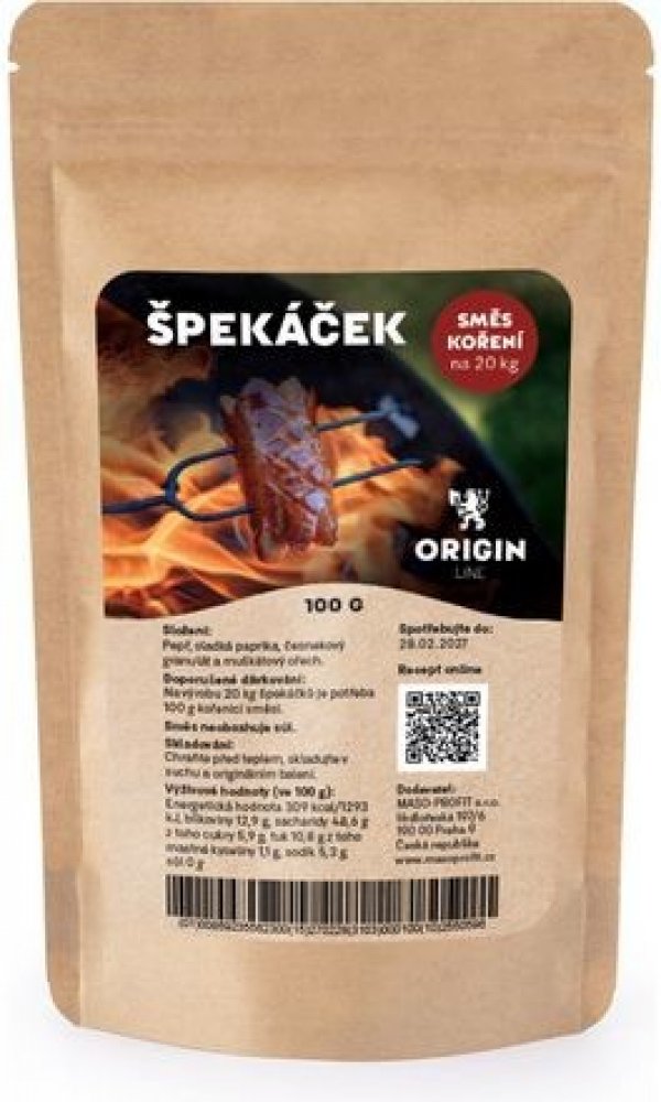 Rádi bychom vám představili novinku od značky Origin line - Kořenící směs pro výrobu špekáčků bez soli a jakýchkoliv pomocných látek. Tato jedinečná směs je vytvořena s láskou a pečlivostí, aby vaše grilované špekáčky dostaly tu správnou chuť a aroma. Recept na přípravu špekáčků naleznete zde.Každá lahodná chuť začíná s kvalitními ingrediencemi. Proto jsme pečlivě vybrali přírodní koření nejvyšší kvality, abychom vytvořili perfektní směs, která dodá vašim špekáčkům dokonalou chuť.S touto směsí je vaše výroba špekáčků ještě jednodušší a chutnější. Stačí přidat 100 g směsi na 20 kg masa.Sázíme na kvalitu a přírodnost, takže můžete být jisti, že každá složka této směsi je pečlivě vybraná, aby vám přinesla ten nejlepší zážitek z vlastní výroby špekáčků.Složení: pepř, sladká paprika, česnekový granulát a muškátový ořech. Dávkování: na výrobu 20 kg špekáčků je potřeba 100 g kořenicí směsi (maso je třeba před výrobou nasolit, kořenicí směs sůl neobsahuje)Koření je zabalené v uzavíratelném sáčku doypack, pro snadné uzavření obalu a uchování koření.