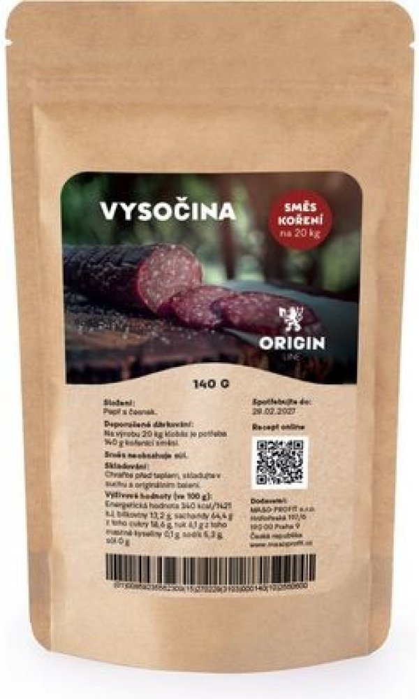 Objevte tradiční chuť české Vysočiny s naší přírodní směsí koření od značky Origin Line, vytvořenou speciálně pro přípravu lahodných uzenin. Recept naleznete zde. Směs obsahuje jen ty nejkvalitnější ingredience – pepř a česnek – které dodávají vašim výrobkům autentickou chuť a aroma.Co dělá naši směs Vysočina tak jedinečnou?Pepř: Přináší intenzivní a pikantní chuť, která zvýrazňuje přirozenou chuť masa a dodává mu potřebnou hloubku.Česnek: Dodává uzeninám bohaté a výrazné aroma, které skvěle doplňuje pepř a zajišťuje harmonický chuťový zážitek.Naše směs je 100% přírodní, bez umělých přísad, barviv nebo konzervačních látek, což zaručuje, že vaše uzeniny budou nejen lahodné, ale i zdravé.Na výrobu 20 kg salámu Vysočina budete potřebovat celý 140 g sáček této směsi. Tato přesně odměřená porce zajistí, že vaše uzeniny budou mít dokonalou chuť a aroma bez nutnosti dalšího vážení a míchání.Přidejte naši Origin Line Přírodní Směs Koření Vysočina do vašich domácích uzenin a zažijte tradiční chuť. Vaši hosté si to jistě užijí stejně jako vy!Origin Line – Pro ty, kteří si chtějí užít přírodních chutí bez kompromisů.Koření je zabalené v uzavíratelném sáčku doypack, pro snadné uzavření obalu a uchování koření.