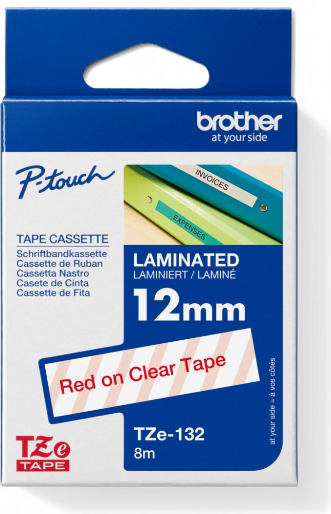 Originální kazeta s laminovanou páskou TZe-132 kompatibilní s širokou řadou tiskáren Brother P-touch je zvláště všestranná díky své snadno čitelné červené barvě na průsvitném podkladu - ideální pro domácnost, kancelář a další pracoviště.
