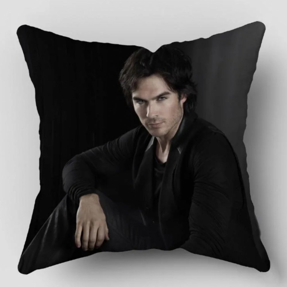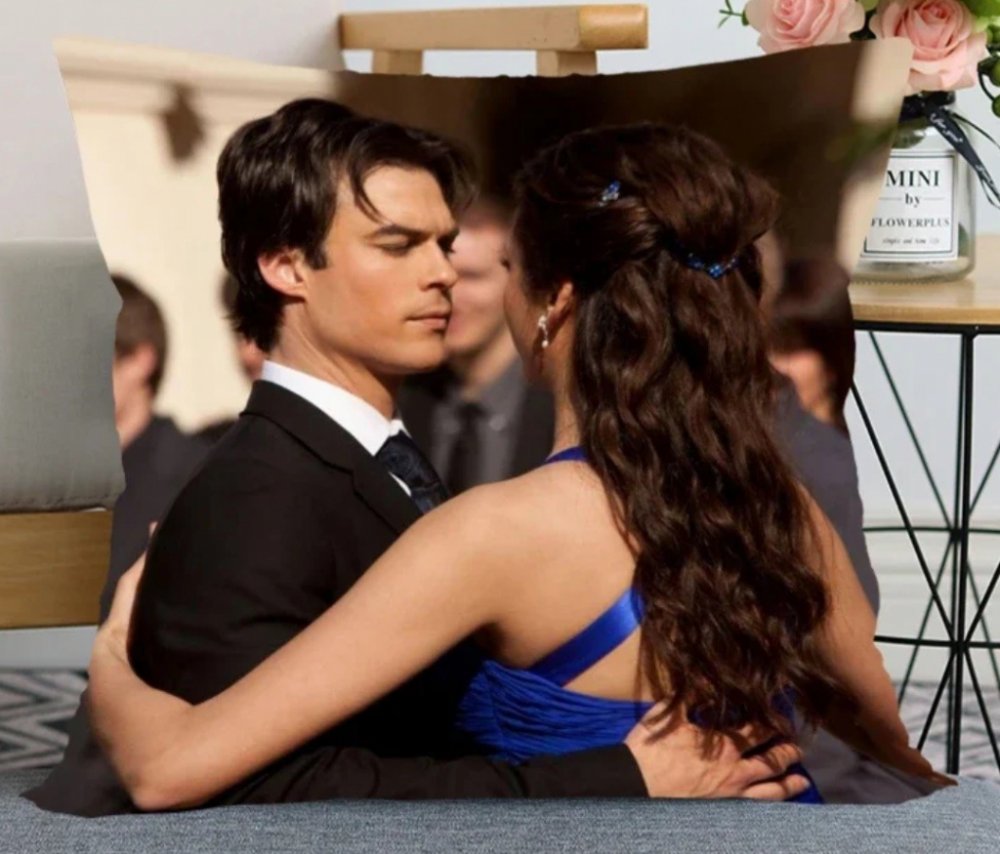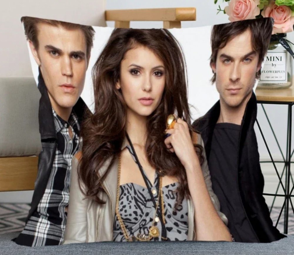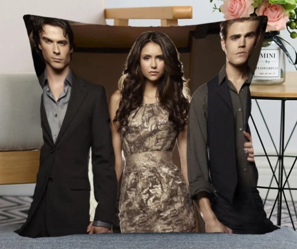 Povlak na polštář The Vampire Diaries (Upíří deníky) se třemi hlavními postavami, které se dostanou do milostného trojúhelníku - Elena Gilbert a bratři Damon a Stefan Salvatore.