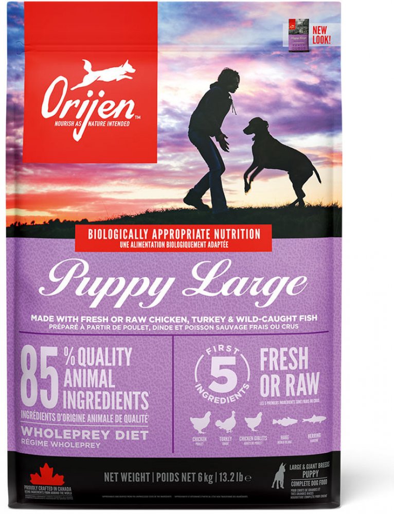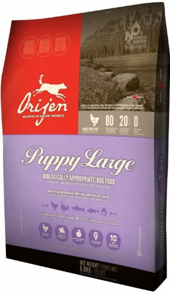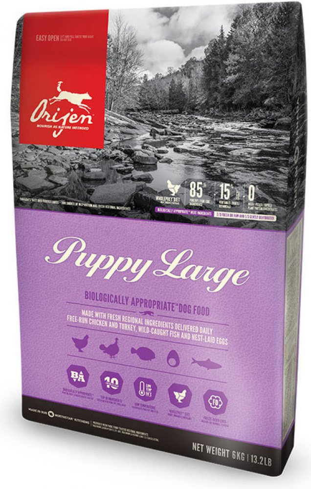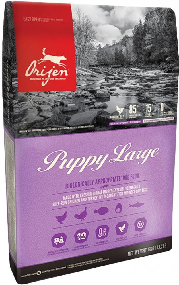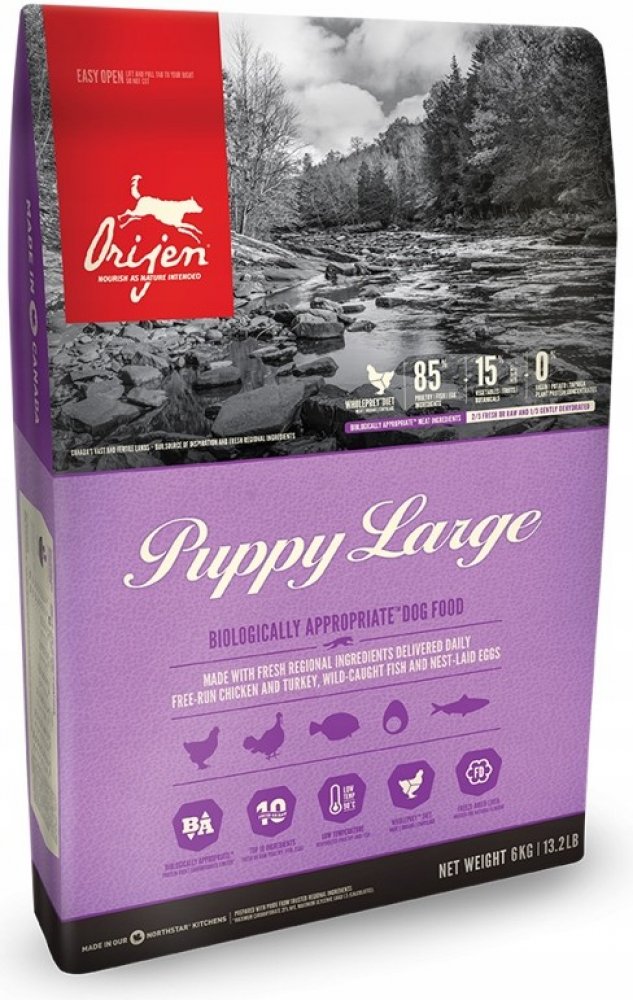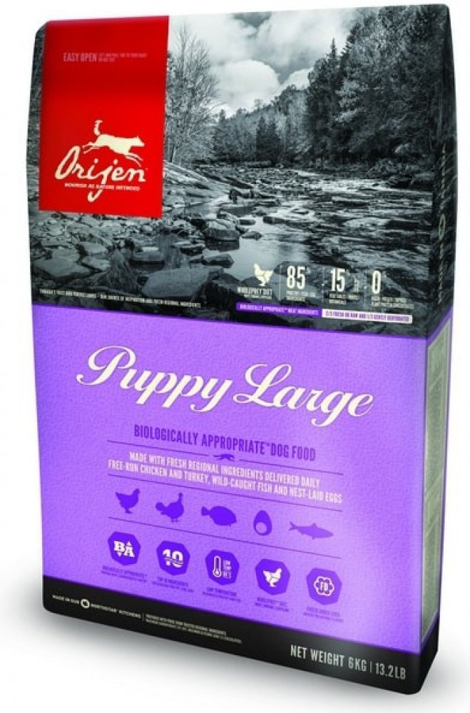 ORIJEN PUPPY LARGE plný živočišných proteinů z volně chovaných kuřat a krůt, ryb lovených v přírodních vodách a vajec z hnízdních chovů. Všechny suroviny jsou nám dodávané čerstvé v bohatě výživném podílu Celé kořisti. Se sníženým obsahem sacharidu a nízkou glykemickou zátěží zajistí krmiva ORIJEN PUPPY LARGE správný vývoj všech štěňat velkých plemen, včetně toho vašeho.