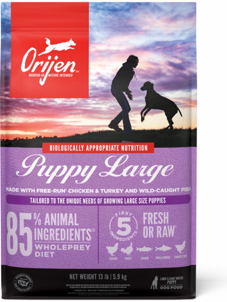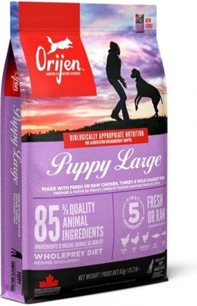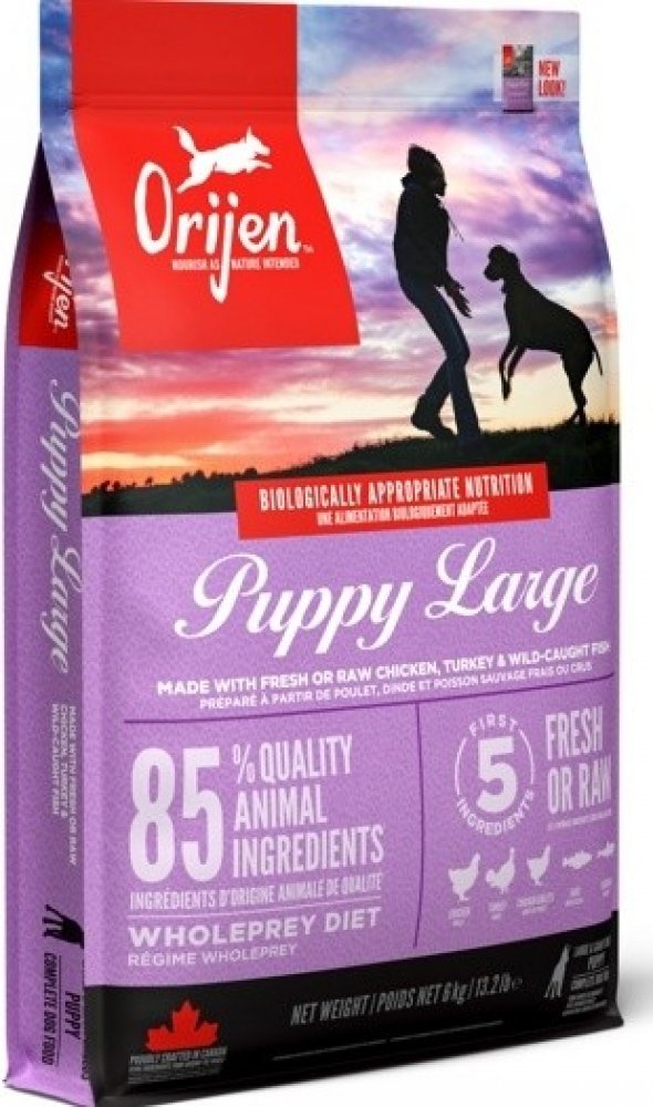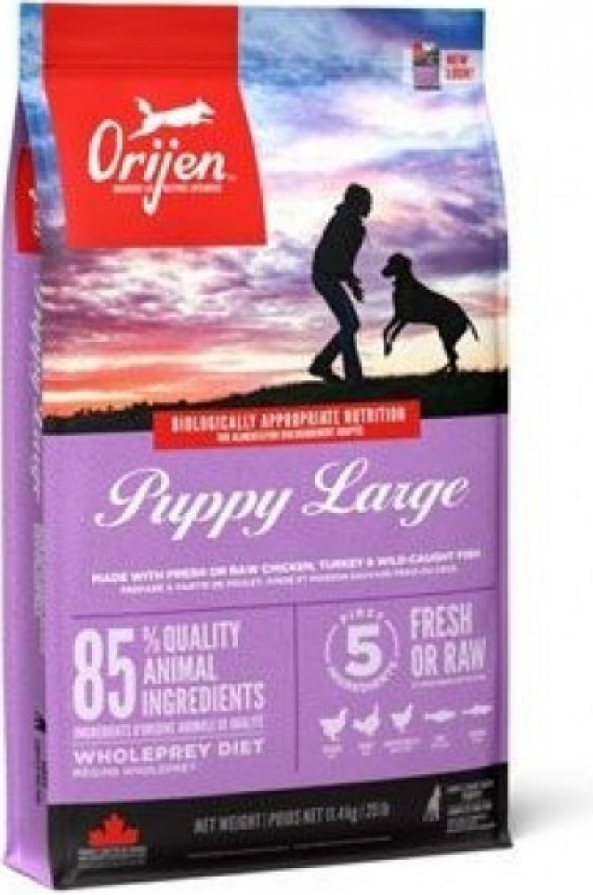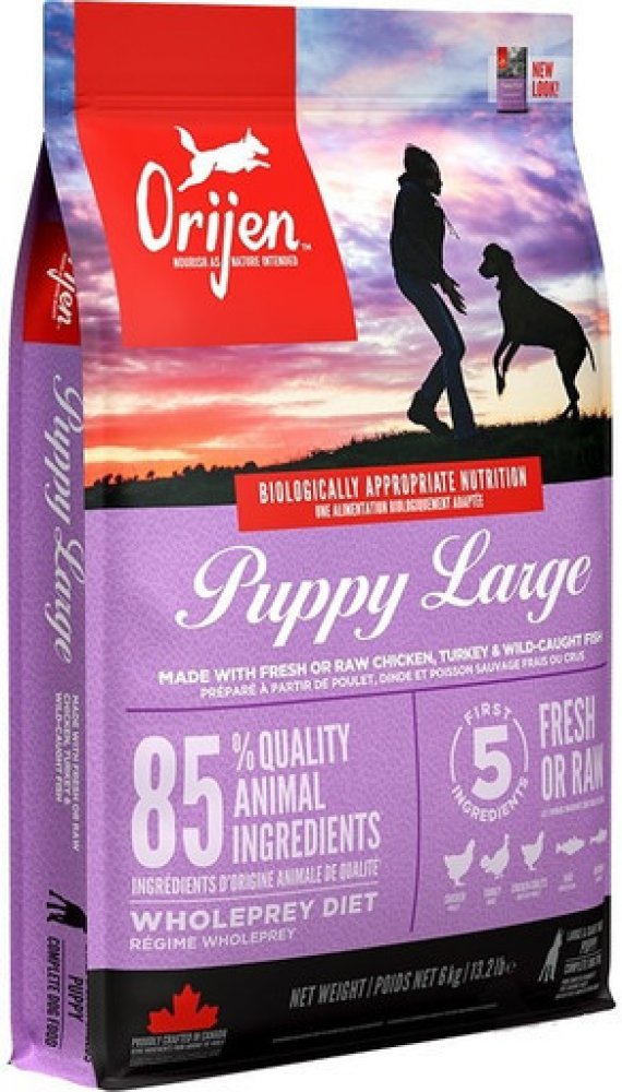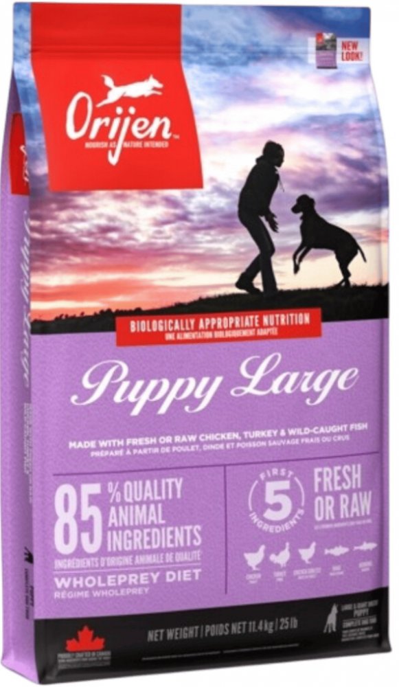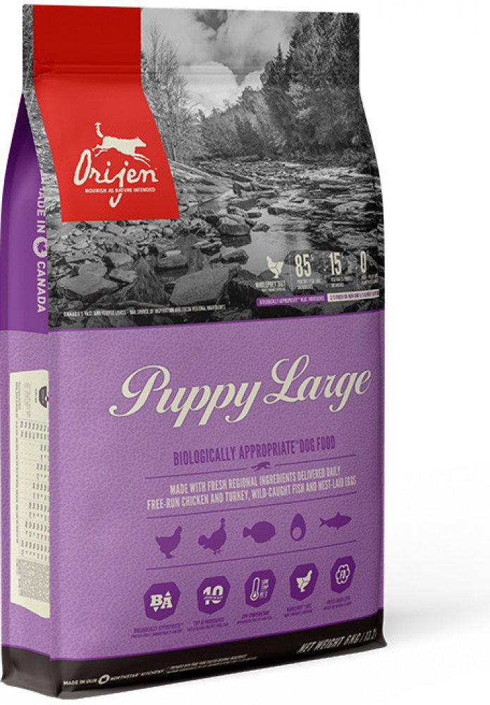 ORIJEN PUPPY LARGE plný živočišných proteinů z volně chovaných kuřat a krůt, ryb lovených v přírodních vodách a vajec z hnízdních chovů. Všechny suroviny jsou nám dodávané čerstvé v bohatě výživném podílu Celé kořisti. Se sníženým obsahem sacharidu a nízkou glykemickou zátěží zajistí krmiva ORIJEN PUPPY LARGE správný vývoj všech štěňat velkých plemen, včetně toho vašeho.