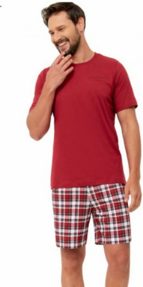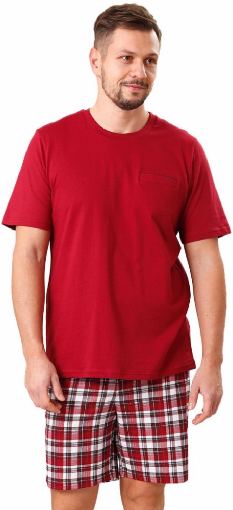 - kulatý výstřih- krátký rukáv- malá kapsa na prsou- barevný lem- vzorované kraťasy bez kapes- široká guma v pase- příjemný bavlněný úplet