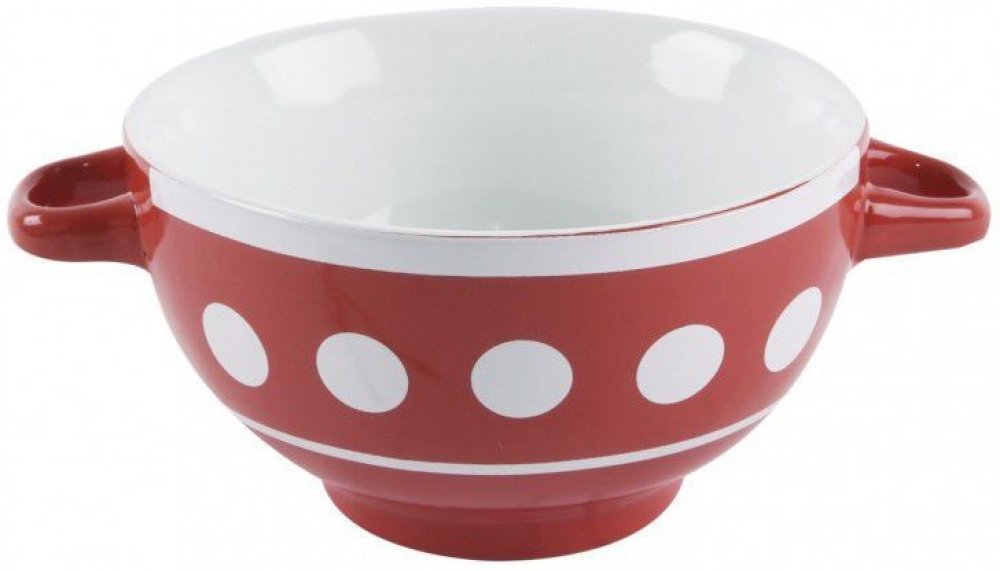 Krásná keramická miska na polévky se dvěma uchy. Zaujme především svým retro vzhledem, který zvýrazňuje červená barva a dekor puntíků. Díky tomu se hodí do interiéru venkovských chalup, ale i rustikálních kuchyní.