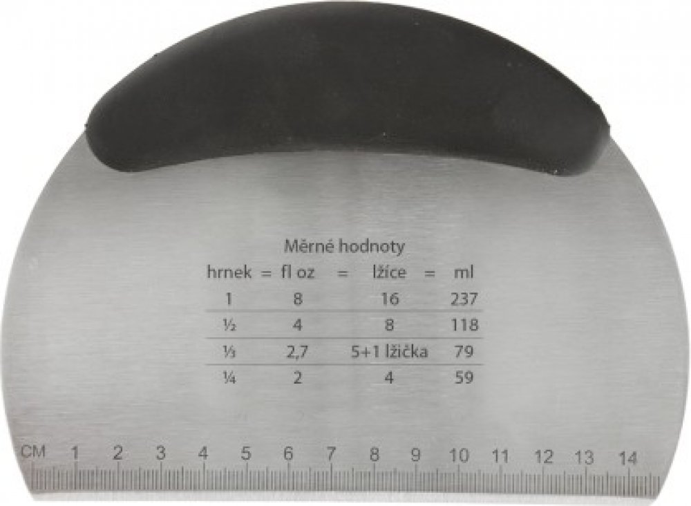 A když vaříte bramborové špalíčky, stačí těsto vyválet, hranou špachtle nakrájet, lehce nabrat a vhodit do vroucí vodyTaké halušky a různé zavářky do polévek protačíte přes síto do vývaru nebo vody.Díky gumové rukojeti z TPR gumy a PP plastu velmi dobře padne do ruky.Na hraně jsou navíc vyznačeny jednotky délky v cm (0 až 14,7 cm), a v ploše je i šikovná tabulka, usnadňující převody měrných jednot...