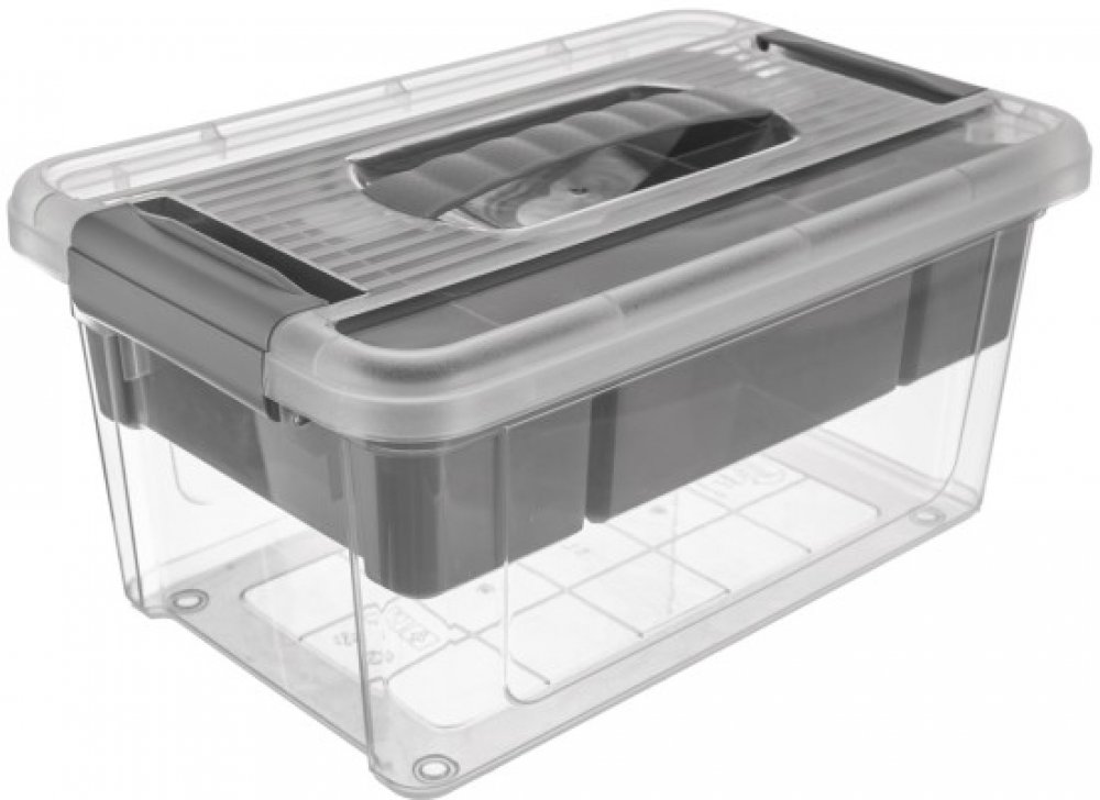 Box obdélníkový transparentní s víčkem na dva pevné klipyStohovatelný. Uvnitř vyjímatelný vklad s přihrádkami. Skvělé využití v domácnosti, v dílně, na šití, kosmetiku, v nemocnicích a zdravotních střediscích, domovech důchodců. Vhodný do myčky.