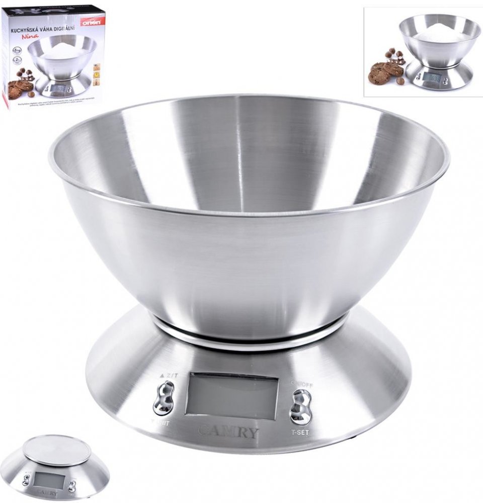 Váha kuchyňská digitální s LCD displejem, s možností vážení v g, oz, ml, lb/oz, fl./oz. Váživost 5 kg, minimální měrná hodnota 1 g Snadná údržba. Indikátor slabé baterie a přetížení.