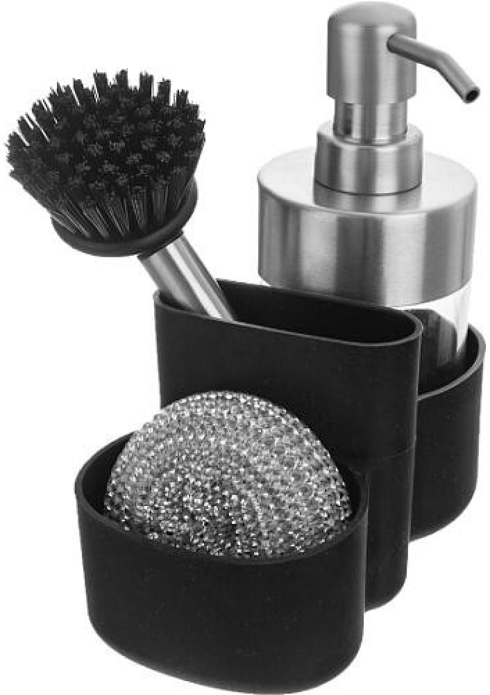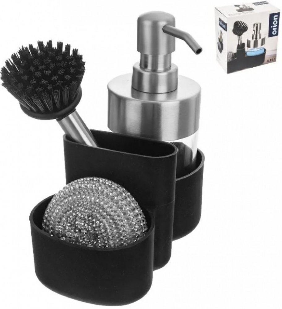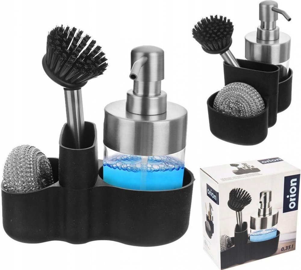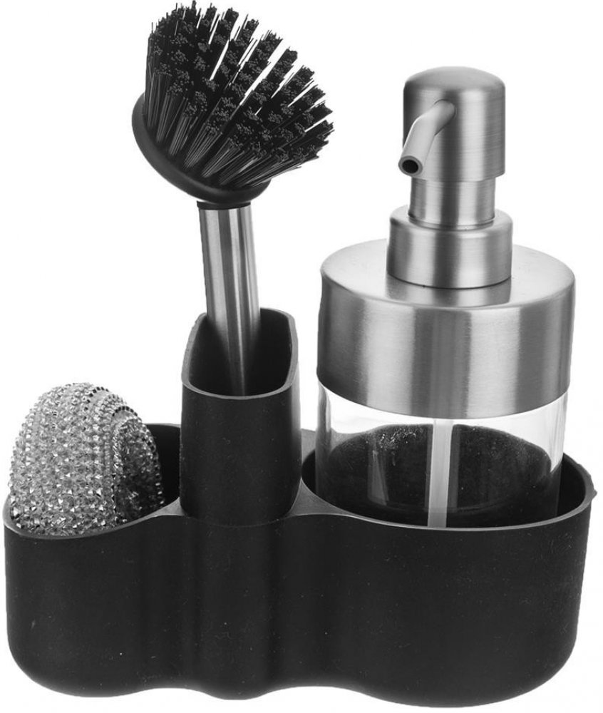 Praktický transparentní dávkovač mýdla nebo saponátu do kuchyně či koupelny ušetří místo a budete tak mít vše potřebné po ruceJe uložen v silikonovém organizéru společně s kartáčkem s plastovými štětinami a nerezovou rukojetí a také s kovovou drátěnkou. Technická specifikaceID produktu: 147401Objem: 350 mlBarva: transparentní, nerezová ocelSymbol výrobce: 530787Materiál: nerezová ocel, plast