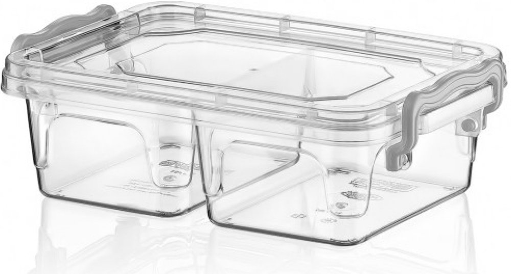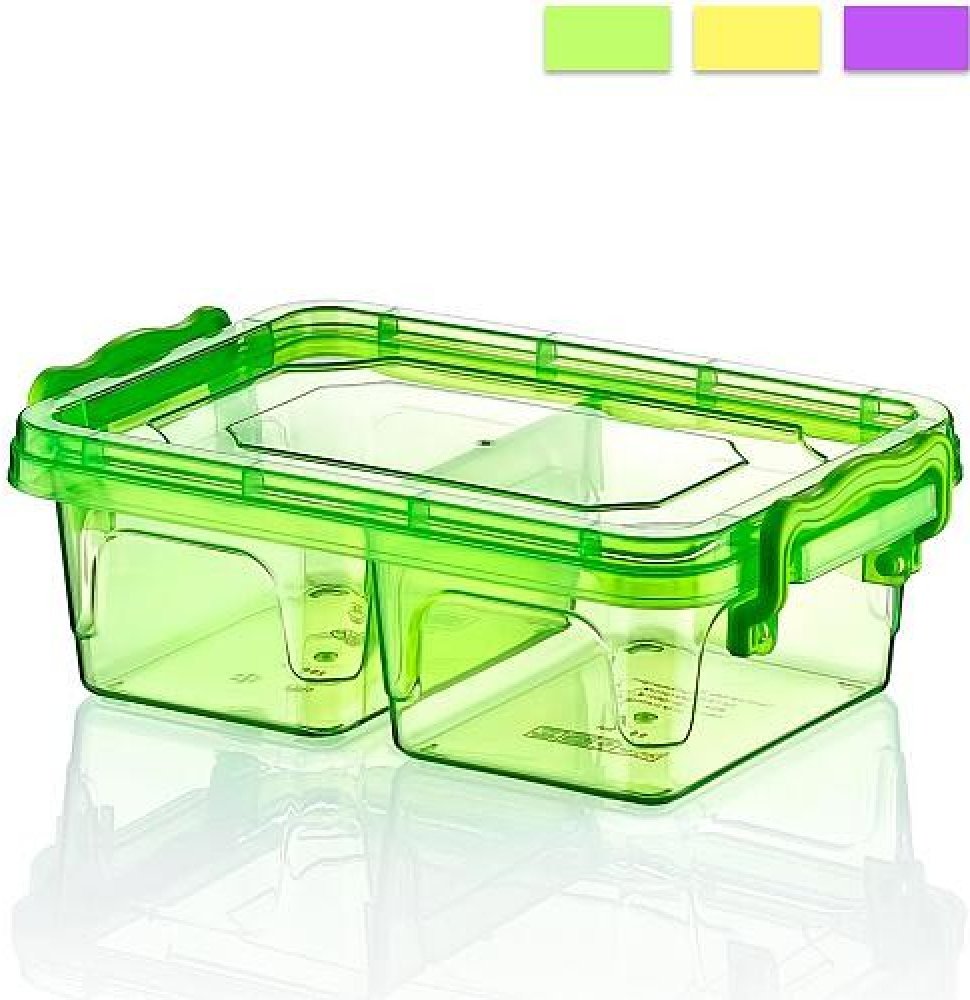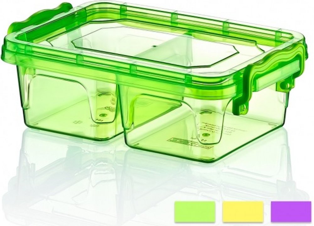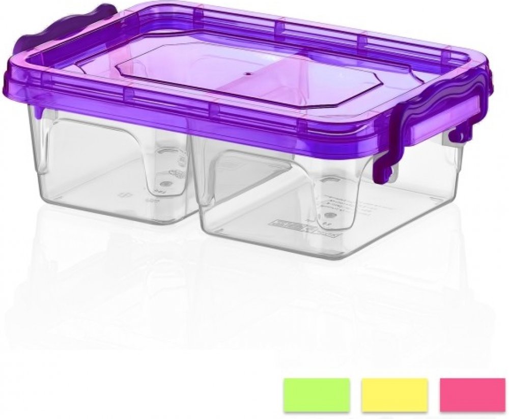 Nízká dvoudílná barevná dóza z kolekce BON se hodí k uskladnění potravin ve spíži, v kuchyňských poličkách nebo v lednici. Má dvě samostatné přihrádky, do kterých můžete dát odděleně například omáčku s masem a knedlíky, krekry s pomazánkou nebo maso s bramborovou kaší. Má celkový objem 500 ml a je vyrobená z kvalitního plastu. Navíc je transparentní, díky čemuž ihned vidíte, co je uvnitř. Pevné uzavření obdélníkové nádoby zajišťuje barevné víko se dvěma klipy. Je možné ji použít i jako úložný box na různé drobnosti v koupelně, pracovně či dětském pokoj, např. k uložení drobných stavebnic, puzzle nebo korálků. Lze ji využít bez víčka i k ohřevu pokrmů v mikrovlnné troubě a umývat v myčce.