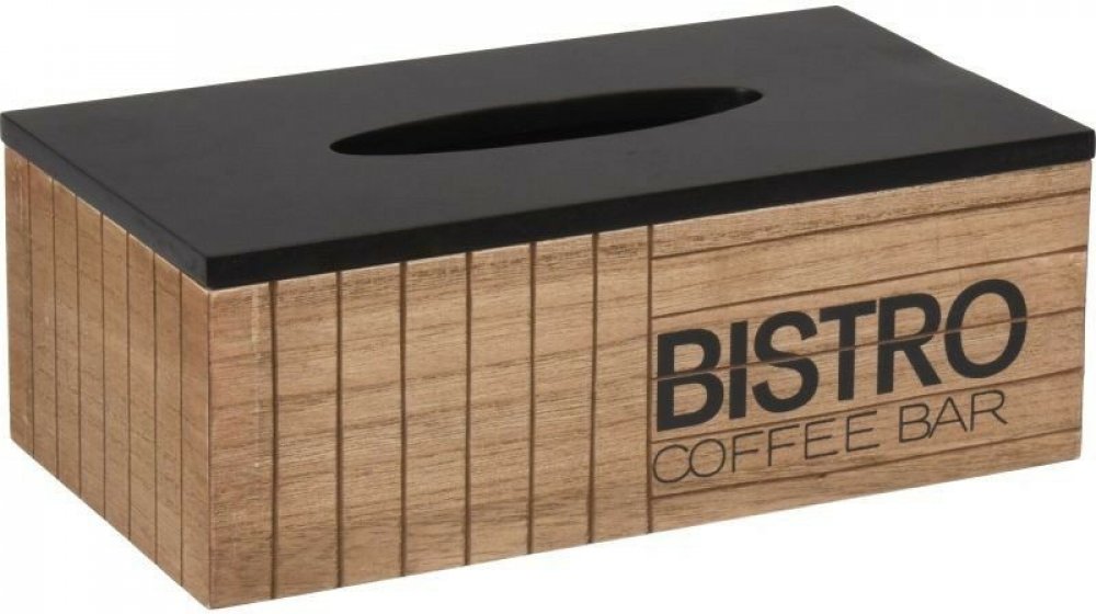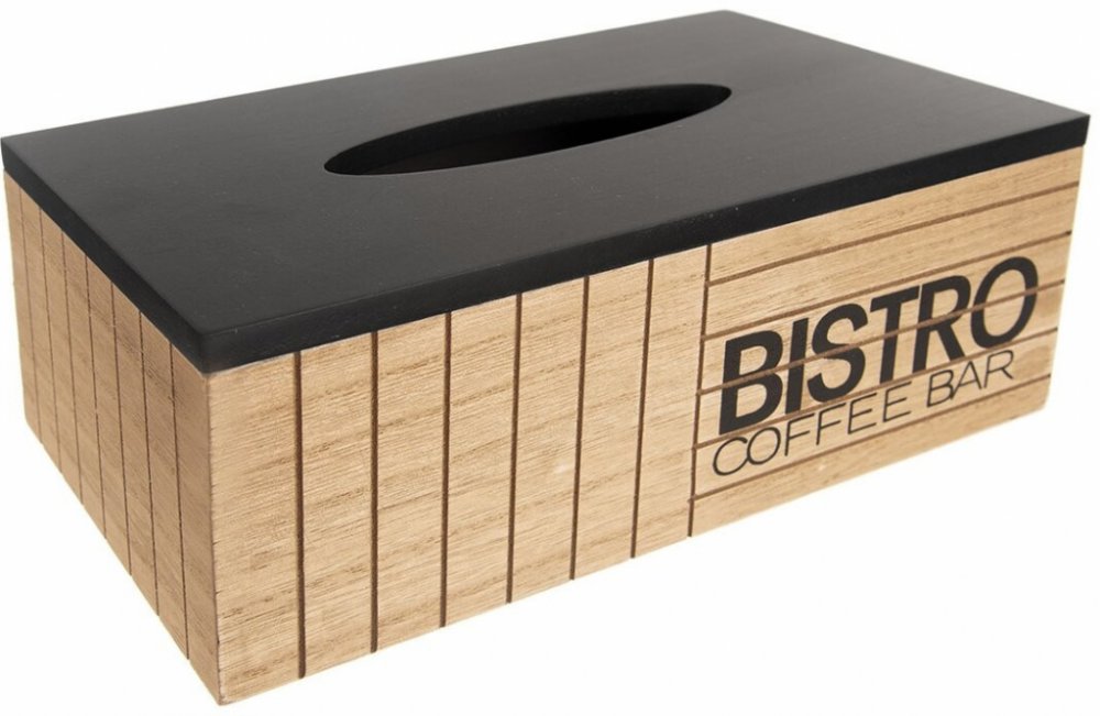 Tento zajímavý box z dřevovláknité desky MDF zdobí nápis Bistro a je stylovým řešením jak uložit často nevzhledné papírové krabičky s kapesníčky, které koupíte v supermarketu.