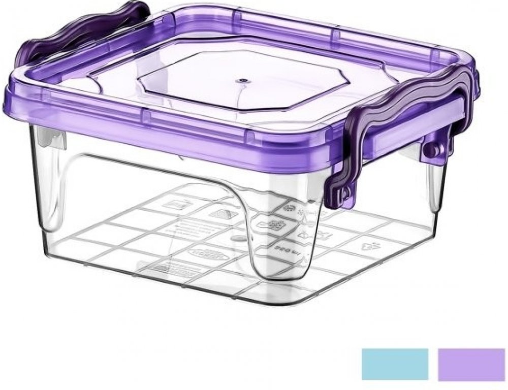 Podrobnosti o produktu OR124283 Barevná transparentní plastová dóza BON čtvercového tvaru o objemu 0,35 l s víčkem na dva klipy.