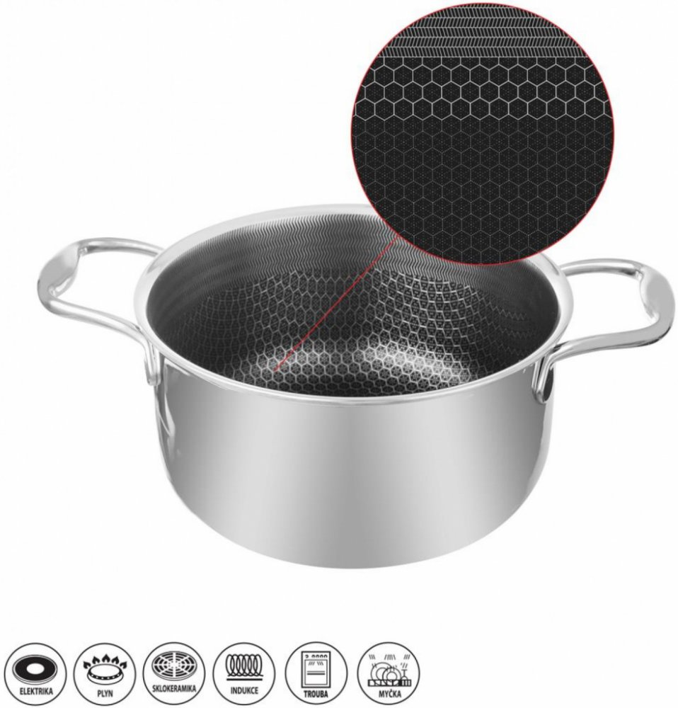 Hrnec průměru 24 cm má uvnitř mnoho bodů, které mají vrstvu povrchu navíc, má tudíž větší tepelnou konzervaci a vyšší přenos tepla než obvyklé nádobí. Díky tomu bude restování, dušení, smažení, opékání a zapékání vašich kulinářských specialit a oblíbených jídel rovnoměrné, efektivní a rychlé.