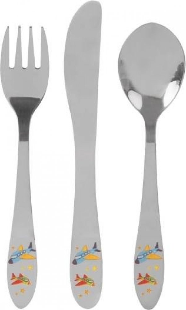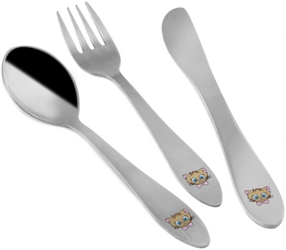 Dětský příbor s barevným dekorem KOCOUŘI. Obsahuje 3 ks - lžíci, vidličku a nůž. Materiál: kvalitní nerez. Tvar přizpůsobený dětem. Lze mýt v myčce na nádobí, ale nedoporučujeme, mohlo by dojít k porušení barevného dekoru, což později nemůže být důvodem reklamace. Rozměry: (délka/šířka) lžíce 15,5/3,5 cm, vidlička 15,5/2,5 cm, nůž 17/2 cm.