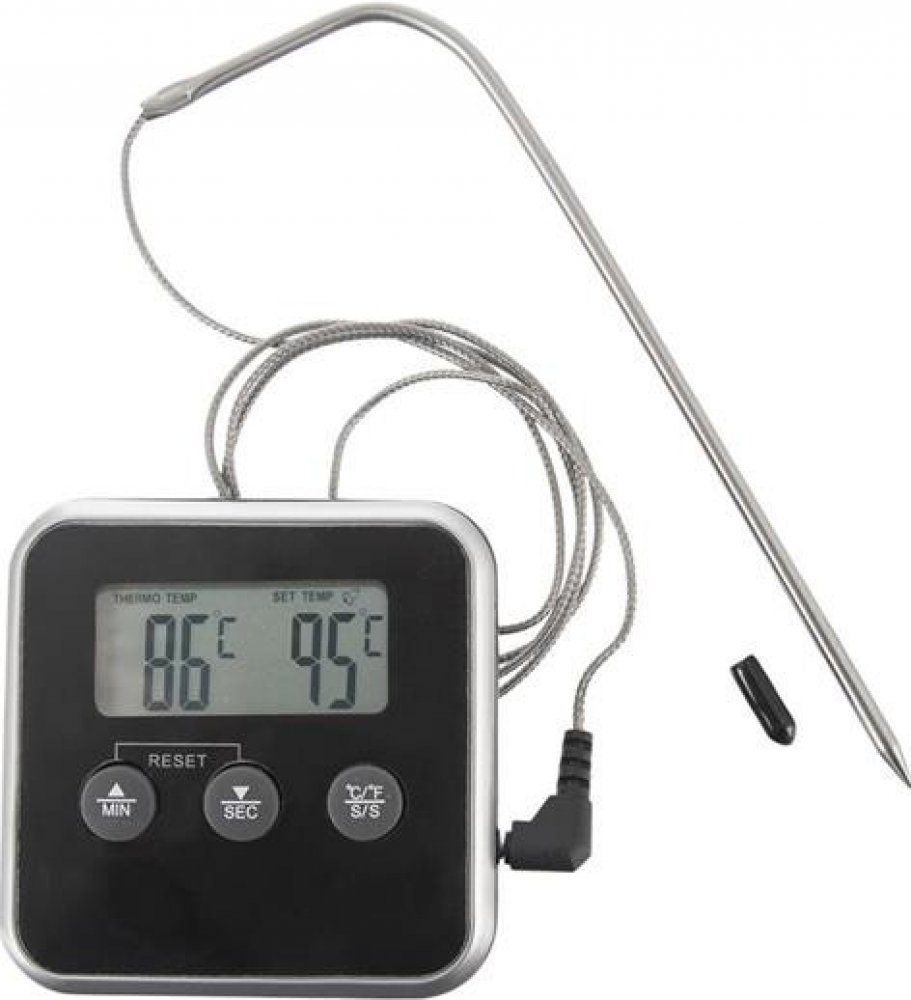 Kuchyňský digitální teploměr se sondou a kuchyňská minutka v jednom je skvělý pomocník nejen při přípravě masa. Využít jej můžete při grilování na grilu, pečení masa v troubě, při uzení v udírně, při chlazení potravin v lednici, při vaření džemů, sirupů, karamelu... Teploměr umožňuje nastavit teplotní alarm při dosažení požadované teploty. Jakmile teplota pokrmu dosáhne zvolené teploty, ozve se zv...