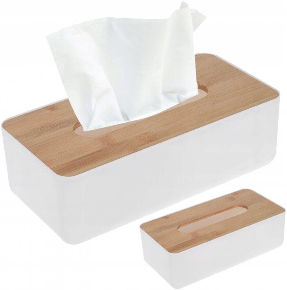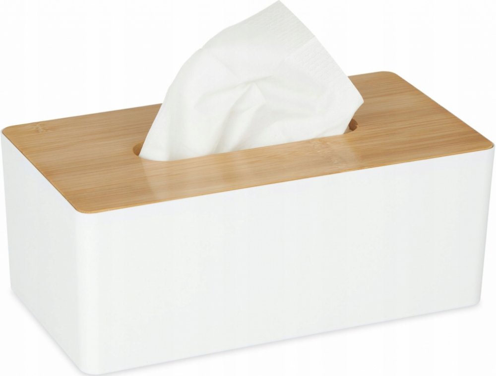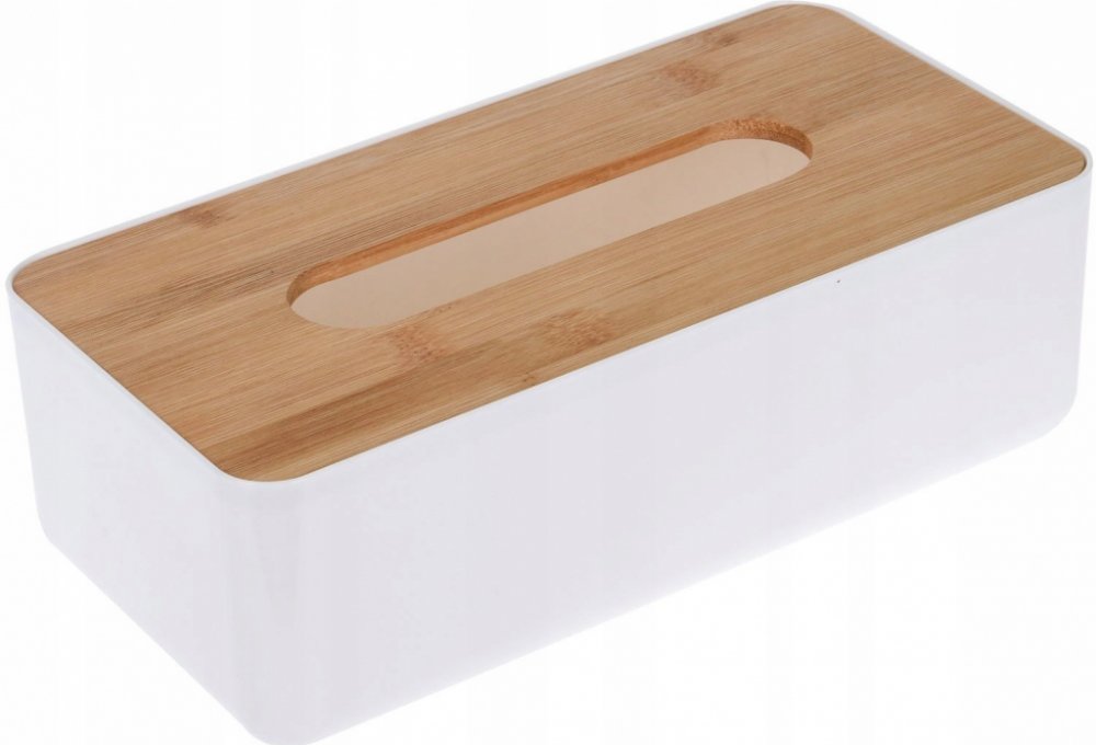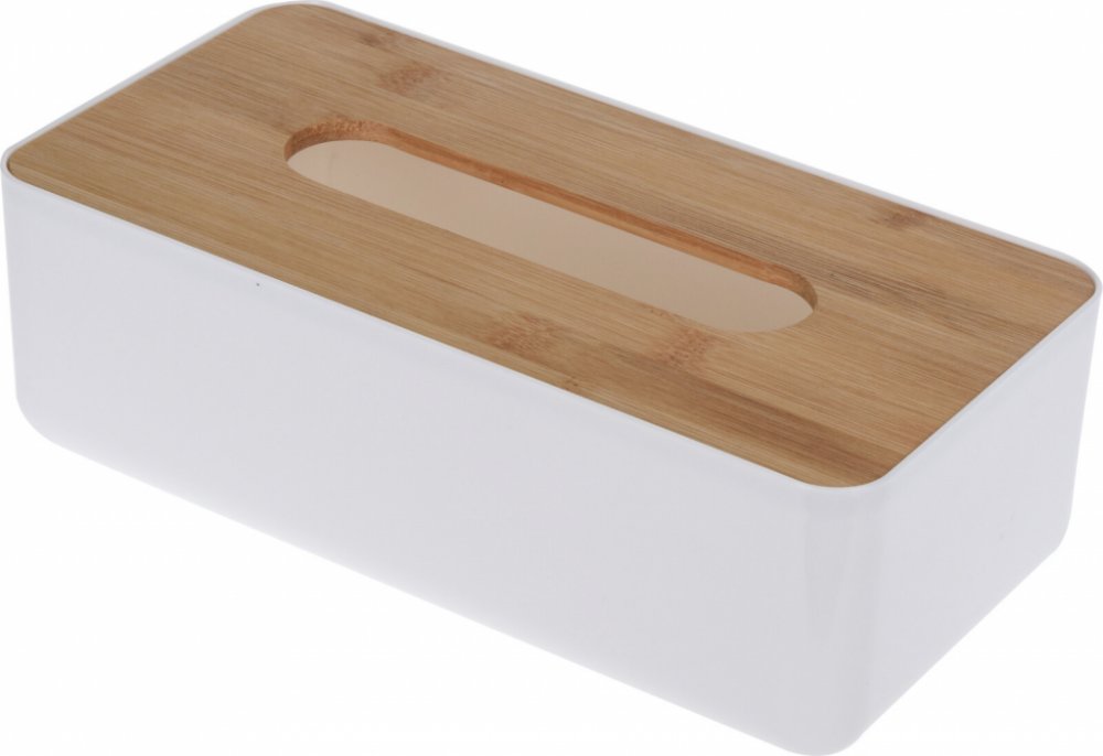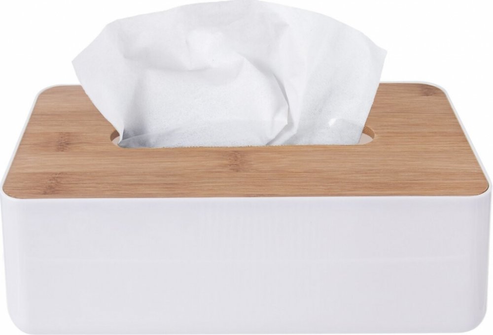 Šikovný plastový box s bambusovým víčkem, do něhož lze jednoduše vložit obdélníkovou papírovou krabičku s kapesníky.