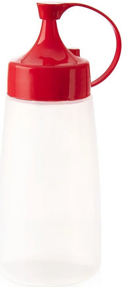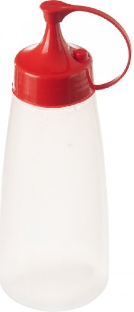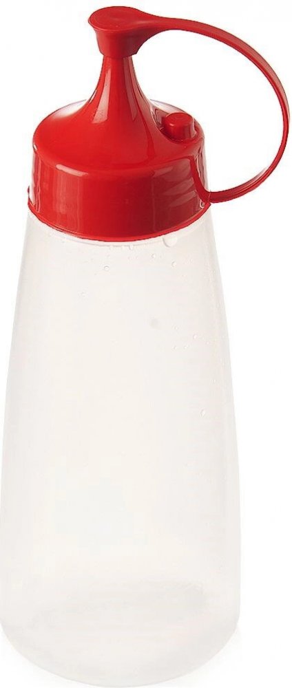 Dávkovací láhev s víčkem. Využijete ji při grilování k snadnému dávkovaní hořčice, kečupu, majonézy, salátových dresinků, čokolády a ovocných sirupů na poháry, na krémy, při polévání masa šťávou při BBQ. Dávkovací víčko s krytem, který můžete sejmout a nasadit na odkládací výstupek, takže vám při dávkování nebude překážet. Materiál: plast PP + LDPE (láhev). Použití max. do 100 °C. Rozměry: objem 340 ml, pr. 6,5 cm, v. 16,5 cm. Vhodné do myčky nádobí i MVT.