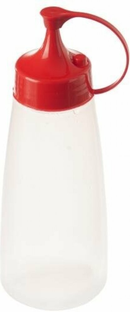 Je vyrobena z poloprůhledného plastu LDPE plastu a kryta víčkem s uzávěrem v červené barvě, který je z PP plastu.