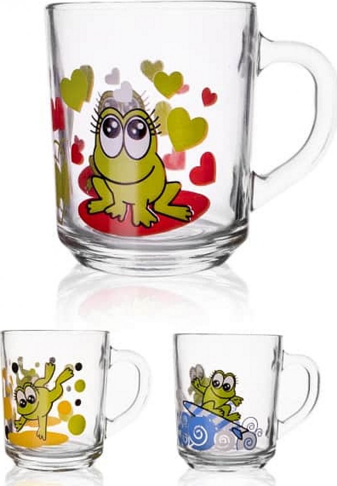 Krásný skleněný hrnek, který má objem 290 ml a zaujme svým roztomilým dekorem ŽÁBA. Hodí se na čaj či horkou čokoládu, ale i limonádu či ice tea.Je možné jej použít v mikrovlnné troubě a umývat v myčce. Vhodný pro děti od 3 let. Dodávaný dekor závisí na aktuálních skladových zásobách. Požadovaný potisk lze pohodlně vybrat i na nejbližší prodejně.