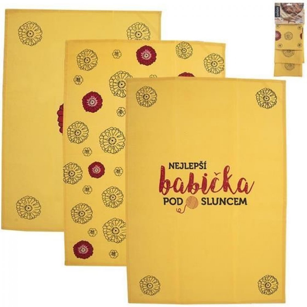 Kuchyňská utěrka na nádobí se skrytým poutkem z kolekce NEJLEPŠÍ BABIČKA. Sada 3 ks – různé dekory. Využít ji můžete také jako napron na střed stolu při prostírání. Výborně saje. Možnost zavěšení.