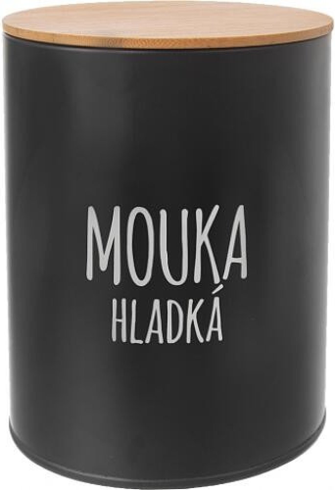 Designová plechová dóza s matným černým povrchem pro uskladnění klasické hladké pšeničné, ale i špaldové, celozrnné nebo kukuřičné hladké mouky.