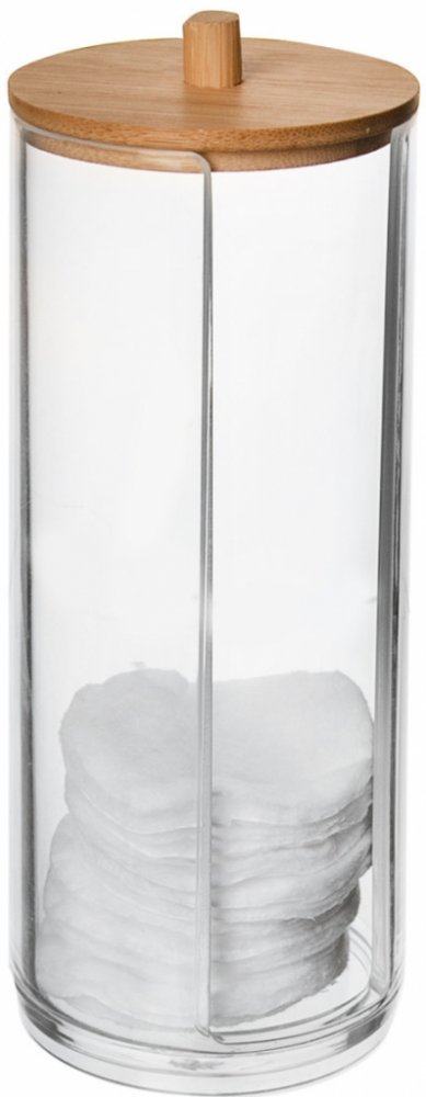 Šikovný zásobník na odličovací tampóny ocení každá žena při večerním odličování make-upu i leckterý adolescent při čištění pleti. Tampónky budou pěkně uložené ve vyšší transparentní dóze s bambusovým víčkem, kam se vejde celé menší balení, prodávané v nevzhledném igelitovém obalu. Stačí ji postavit na polici nebo uložit do koupelnové skříňky.