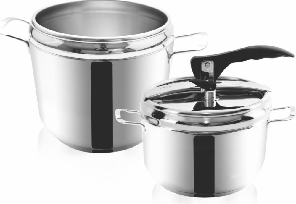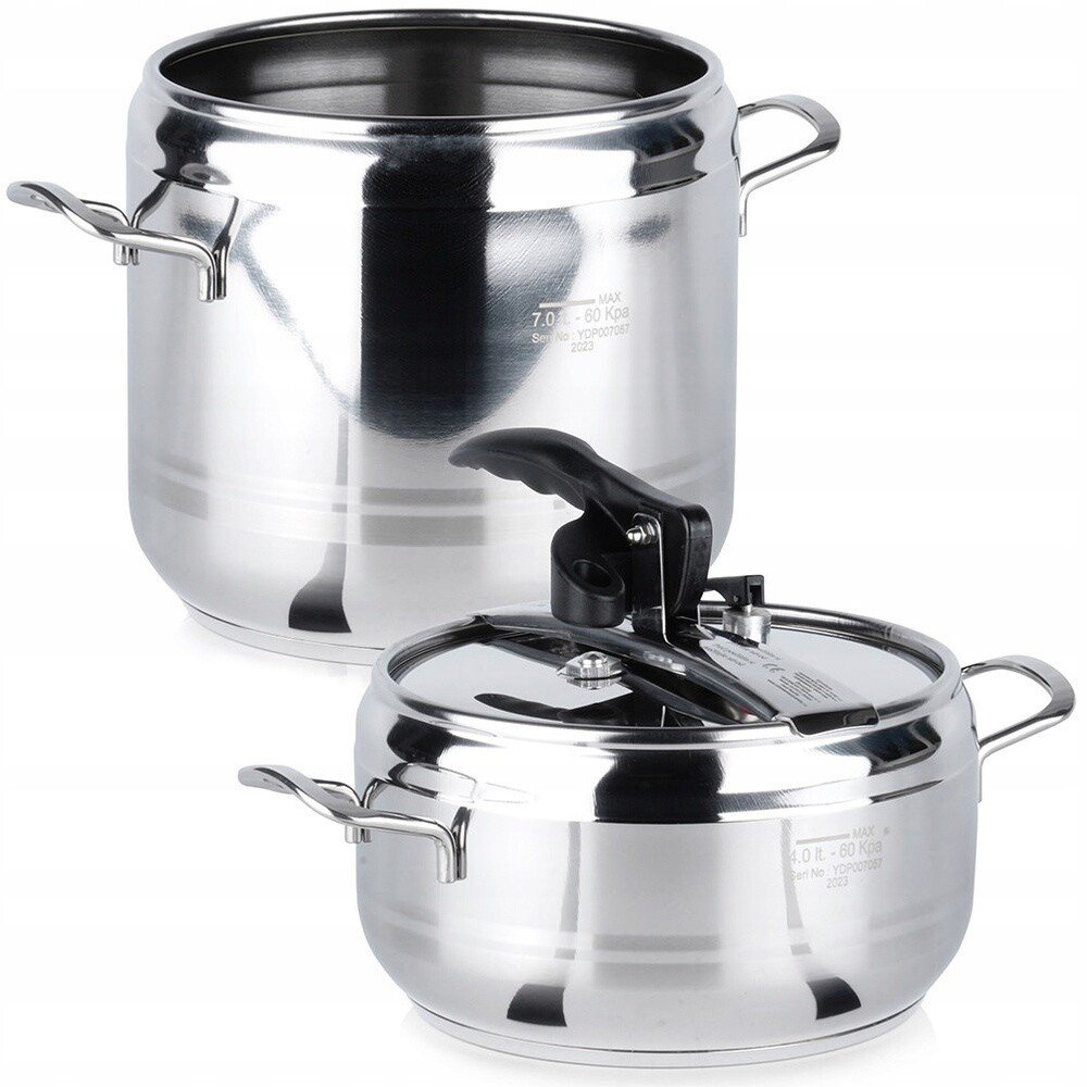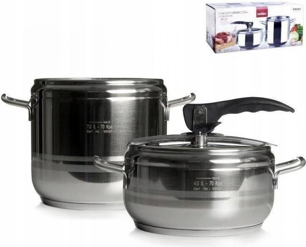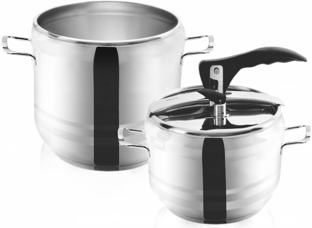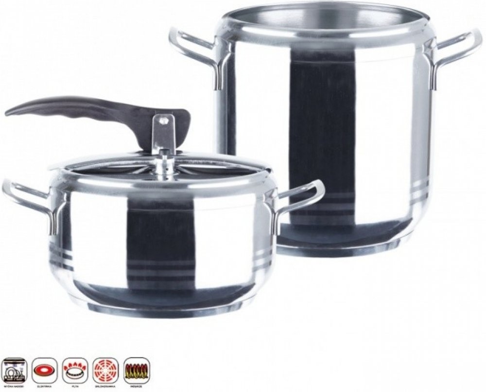 Sada tlakových hrnců o objemu 4 a 7 l. Silné 3vrstvé dno pro úsporu energie a času. Opatřeny pružným víkem s tvarovanou rukojetí a ventily pro upouštění tlaku.