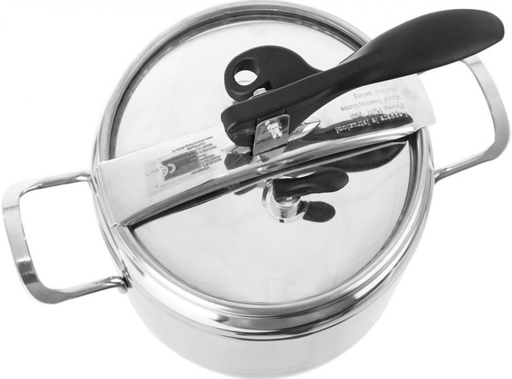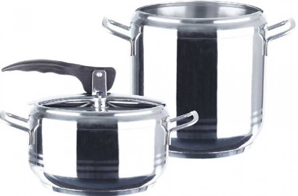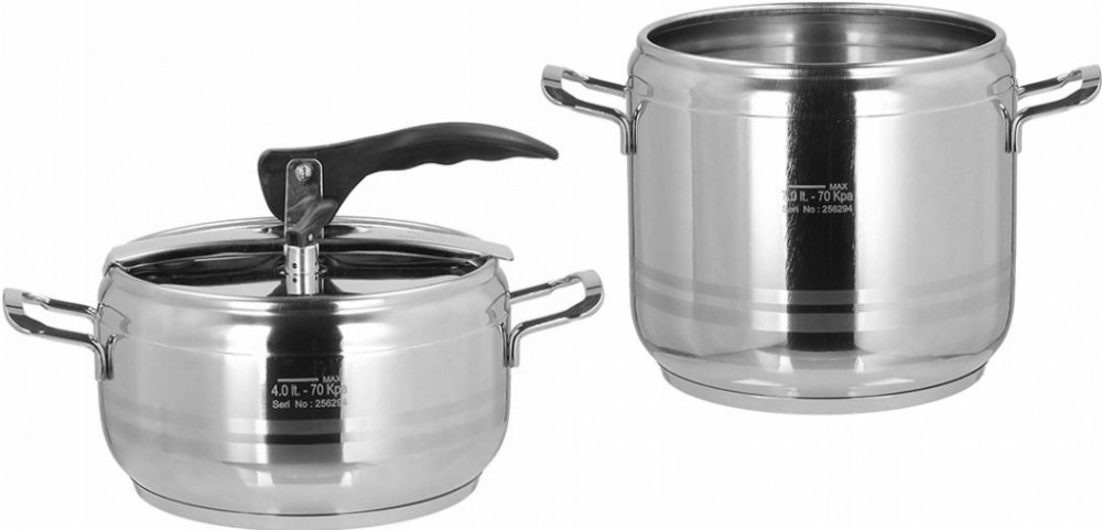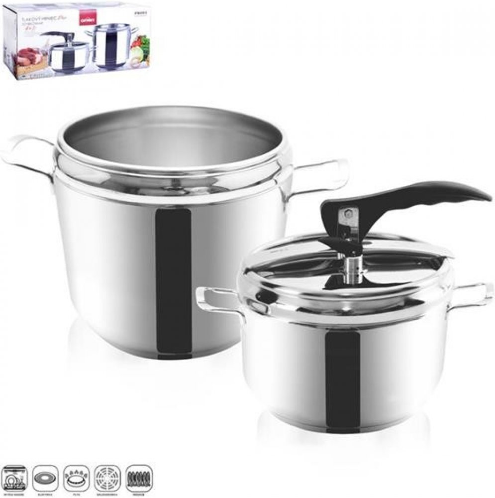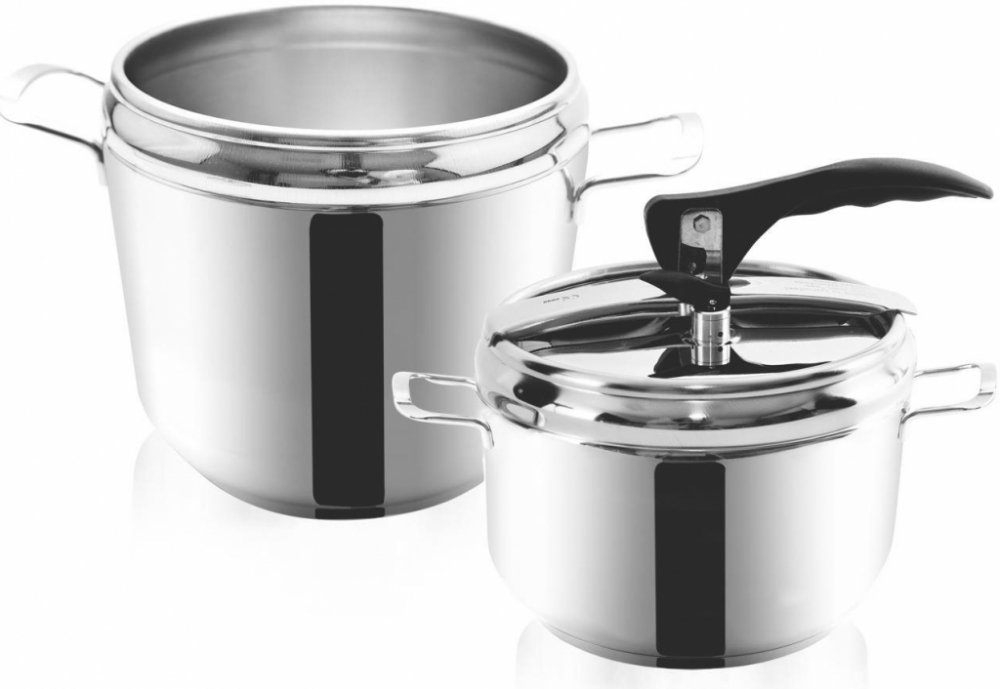 Sada tlakových hrnců o objemu 4 a 7 l. Silné 3vrstvé dno pro úsporu energie a času. Opatřeny pružným víkem s tvarovanou rukojetí a ventily pro upouštění tlaku.