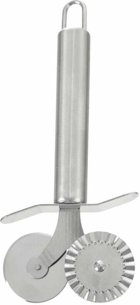 Dvojité rádýlko na těsto s vlnitým a hladkým břitem na přípravu knedlíků, buchet, těstovin, sladkého a slaného pečiva. Opatřeno chráničem prstů. Materiál: nerezová ocel 430 S/S. Rozměry: d. 17 cm, pr. 3,8 cm, š. 7,5 cm. Možnost zavěšení. Lze mýt v myčce.