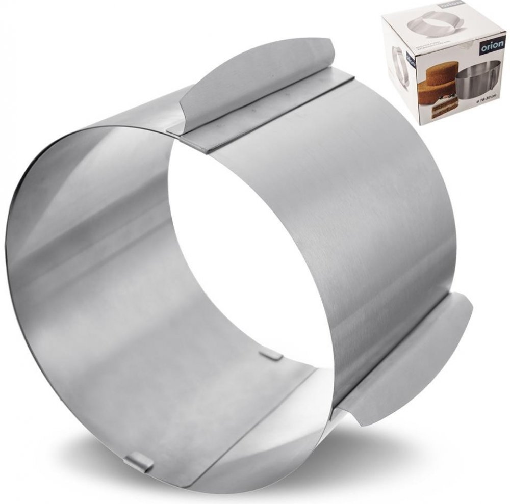 REGULOVANÉ - Kulatá forma na pečení koláčů a zákusků. Díky nastavitelnému okraji se hodí na dorty o průměru 16 - 30 cm, výška 14,5 cm. O DOLNÁ - Vyrobena z nejkvalitnější nerezové oceli. PERFEKTNÍ - Mimořádně užitečná při pečení dortů a koláčů a dalších pochoutek. FUNKČNÍ - Díky velkému rozsahu nastavení můžeme péct dorty a koláče té správné velikosti pro nás. Součástí balení jsou dva klipy pro uchycení nastavitelné velikosti. VYTVOŘENÝ NASTAVITELNÝ ROZSAH - Správný tvar formy zajišťuje snadné používání. Vnitřní část ráfku má vytištěný rozsah nastavení ráfku.Nastavitelná forma na pečení dortů a koláčů. Díky ní můžete připravovat koláče různých průměrů. Robustní provedení a velmi snadná manipulace. Forma usnadňuje přípravu např. piškotového dortu. Vhodná pro použití ve všech typech trub. Originální výrobek české značky Orion, vyrobený v souladu s evropskými normami. Posuvná forma na pečení dortů různých velikostí . Formu stačí namazat olejem a vysypat moukou, položit na pečicí papír na rovném plechuPo upečení lze korpus naplnit hustším krémem, ovocem, želatinou apod.Po vychlazení a zatuhnutí náplně opatrně na bocích odřízneme a formu rozevřením sejmeme.K tomu slouží praktická držadla, forma drží požadovaný tvar díky aretačnímu pásku na boku.Po použití ji lze umýt v teplé vodě se saponátem.Forma je skladná, uložíte ji do zásuvky, kde po zmenšení nezabere tolik místa. Pečicí forma na dort, ocelová