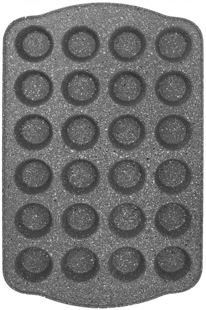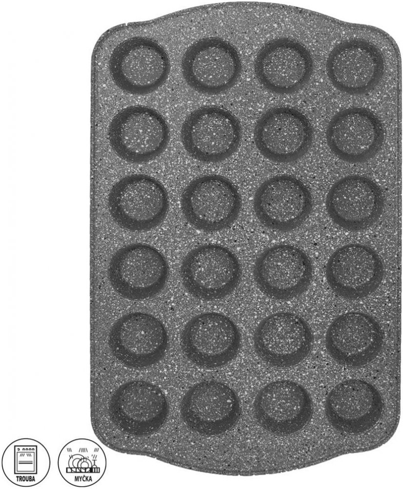 Plech na mini muffiny/košíčky s kvalitním nepřilnavým povrchem, který brání připečení, a to i při použití minimálního množství tuku. Upečené dobroty snadno z plechu vyjmete. Můžete použít také papírové nebo silikonové košíčky. Doporučujeme formu vymazat nebo vystříkat sprejem na pečení. Použijte kuchyňskou chňapku. Vhodná do plynové, elektrické i horkovzdušné trouby. Lze mýt v myčce na nádobí. Roz...