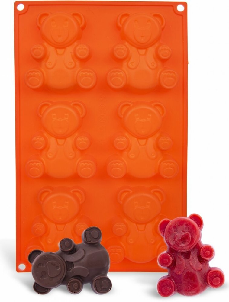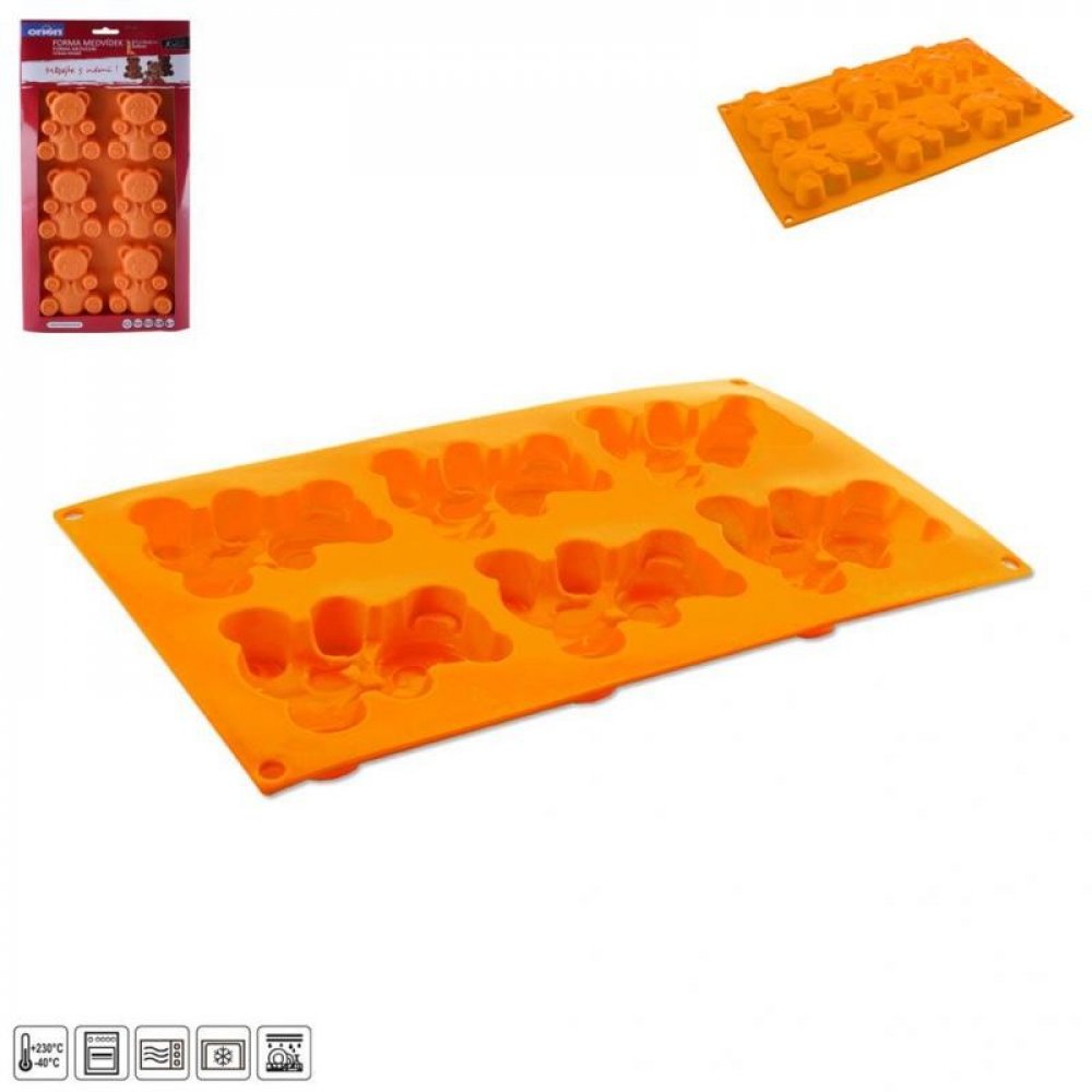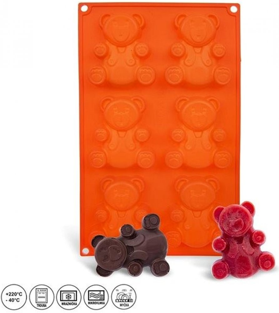 Forma na pečení vám pomůže vytvořit medvídky, kterými potěšíte především děti. Můžete je upéci z piškotového nebo litého těsta, naplnit čokoládou, marmeládou, ozdobit polevou, můžete v nich zmrazit ovocnou dřeň. Ve formě připravíte 6 ks medvídků.Materiál: silikon - forma je lehká, skladná, nepřilnavá, těsto se v ní nepřipéká, nepohlcuje pachy z potravin, je odolná teplotám od -40 °C do +220 °C. Snadno se udržuje, lze ji mýt v myčce na nádobí. Forma je vhodná do plynové, elektrické i horkovzdušné trouby, do chladničky i mrazničky.