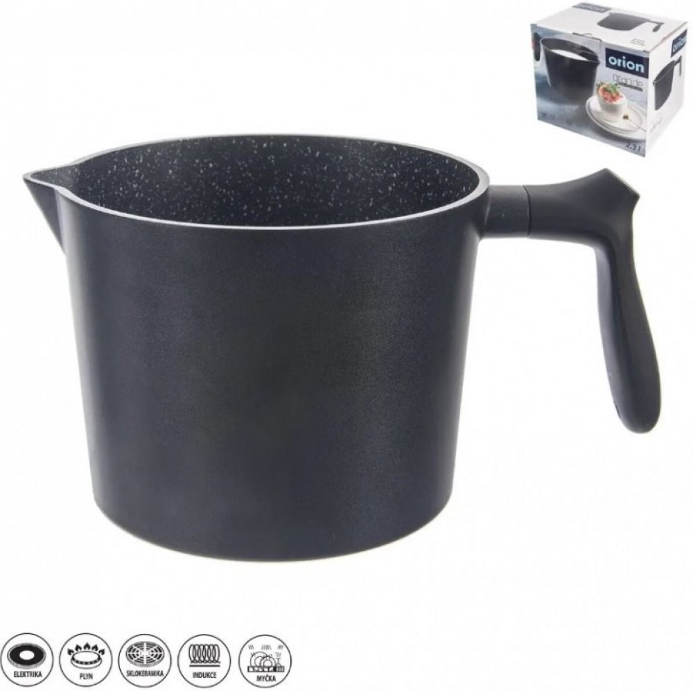 RendlíkHorké mléko se kromě přípravy nápojů, jako je kakao, používá k svaření pařížské šlehačky, vaření pudinku a základů různých krémů.I domácí jogurt má v základu receptury teplé mléko, do kterého se přidává lžíce jogurtu.Také příprava bešamelu bude hračka díky nepřilnavému povrchu uvnitř tohoto rendlíku.Je opatřen praktickou výlevkou a plastovou rukojetí. Hliníkový korpus je potažen kvalitní nepřilnavou vrstvou PFLUON GRANIT, která umožňuje vaření s minimem tuku.Omáčky, krémy i zredukované šťávy snadno stáhnete třeba stěrkou.Přednosti nádobí Grandevyrobeno ze slitiny hliníku potaženého velmi kvalitním antiadhezním povrchem PFLUON GRANITpevná rukojeť zajistí bezpečnou manipulacinádobí je kompatibilní se všemi druhy varných desek včetně indukcesilné sendvičové dno šetří energiinaakumulovaná energie předává teplo rovnoměrně dále do nádoby, proto lze sporák vypnout s předstihem a nechat pokrm "dojít"lze umývat v myčce, avšak vlivem agresivních čisticích prostředků může dojít k nepatrné oxidaci (tento stav nemá vliv na proces vaření, není zdravotně závadný a nemůže být důvodem reklamace).Doporučujeme: používejte velikost plotýnky úměrnou průměru nádoby a dřevěné, silikonové nebo nylonové náčiní.Orion tip: aby mléko neuteklo, položte na horní lem vařečku. Tak to dělávaly už naše babičky. Dřevěná rukojeť totiž narušuje povrch zpěněného mléka a zabrání tak vzkypění. Také pro delší prováření šťáv a omáček můžete použít samostatně prodávanou poklici.
