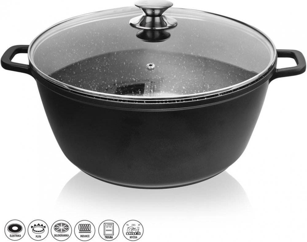 Masivní hrnec s poklicí s velmi kvalitním nepřilnavým povrchem PFLUON GRANIT. Můžete v něm vařit, smažit, dusit, opékat a zapékat s minimální spotřebou tuku. Připravovaný pokrm se nepřipéká. Poklice s otvorem pro únik přebytečné páry. Vhodný na všechny typy spotřebičů včetně indukce i trouby. Doporučujeme použití kuchyňské chňapky. U plynových sporáků volte správnou velikost plamene, u elektrický...