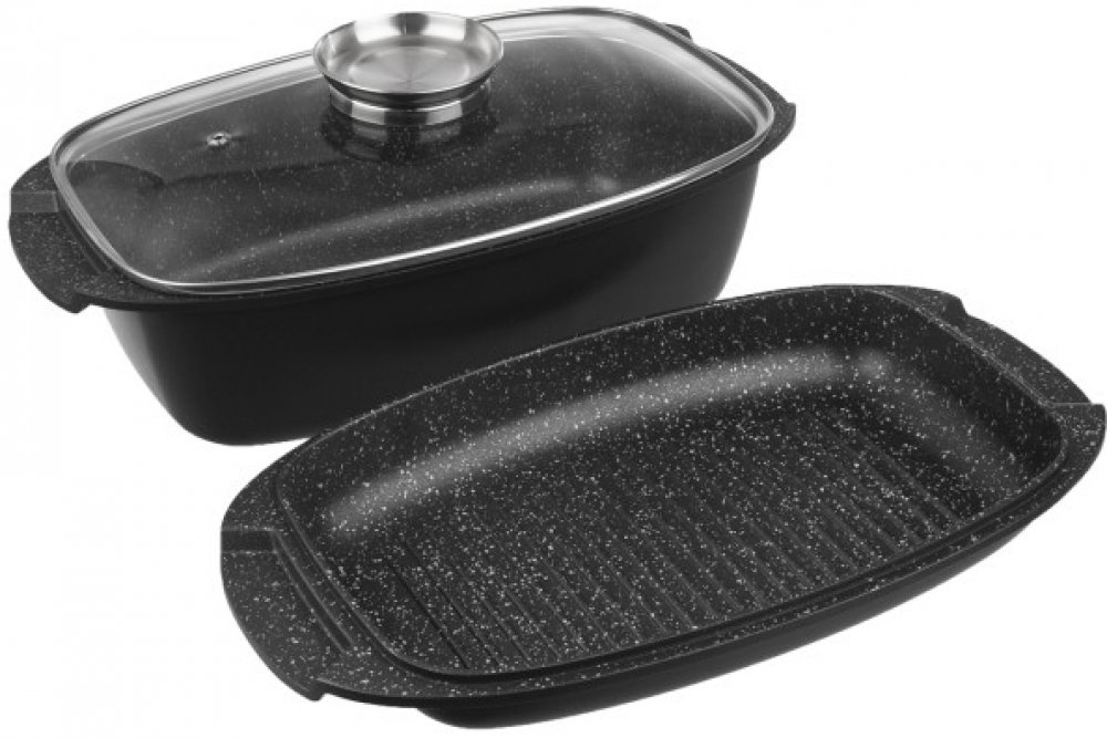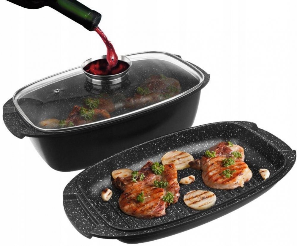 Všestranný pekáč s nepřilnavým povrchem o celkovém rozměru 39x22x10 cm má víko se žebrovanou strukturou pro pečení skvělých steaků nebo zeleiny, které lze použít jako samostatný pekáč o rozměru 39x22x5 cm. Po přiklopení má výšku 15 cm, takže se pohodlně vejde do trouby. Hliníkový korpus je potažen kvalitní nepřilnavou vrstvou PFLUON GRANIT, která umožňuje pečení s minimem tuku, ale i snadnou údržb...
