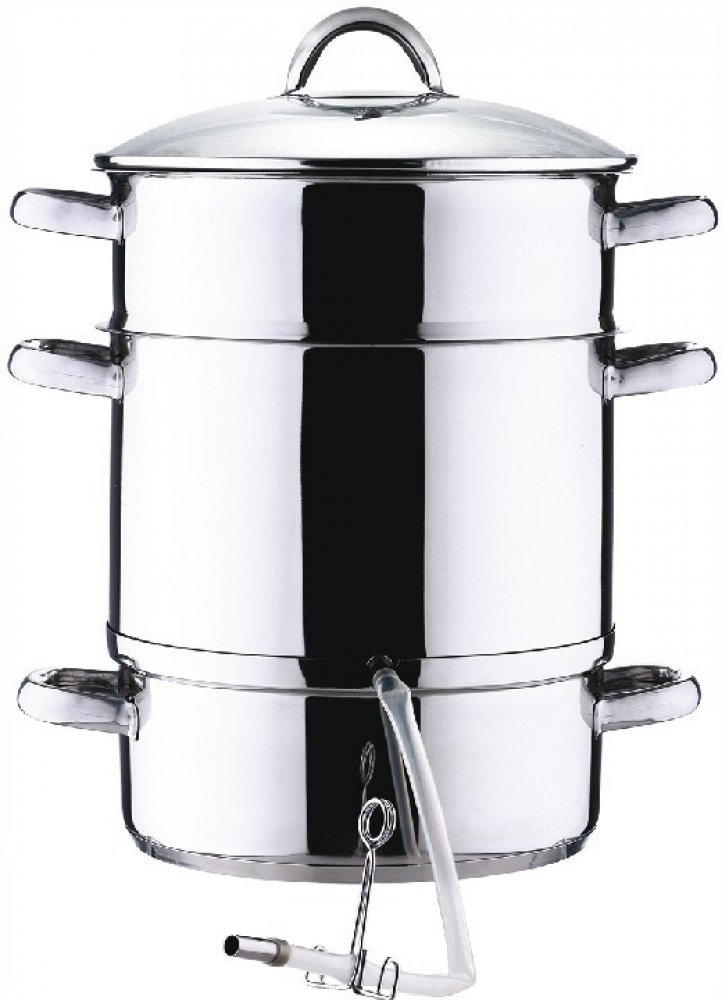 Praktický nerezový odšťavňovač o objemu 8 litrů, 2v1 — jako odšťavňovač a hrnec s poklicí. Sada obsahuje vše potřebné k přípravě čerstvých šťáv a konzerv.