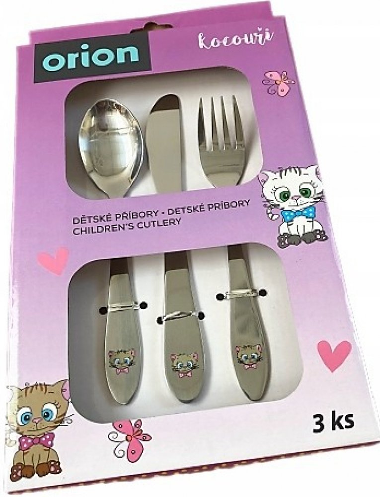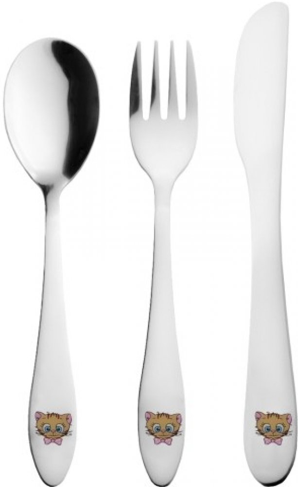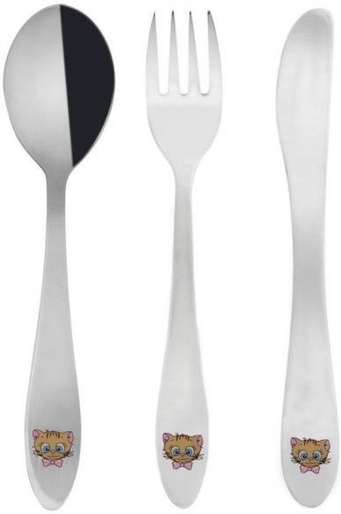 Příbory s motivem roztomilých kocourků s mašlí slouží pro nácvik správného stolování. Sada obsahuje lžíci délky 15,5 cm, vidličku 15 cm a nůž délky 17 cm. Svou velikostí a váhou jsou uzpůsobeny malým dětským ručkám.