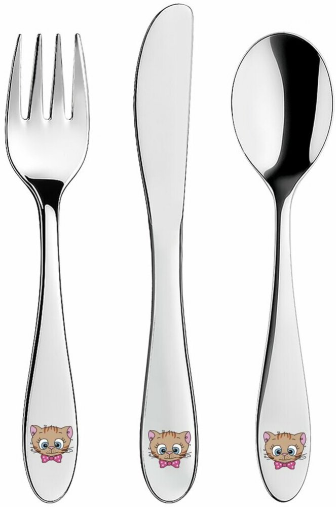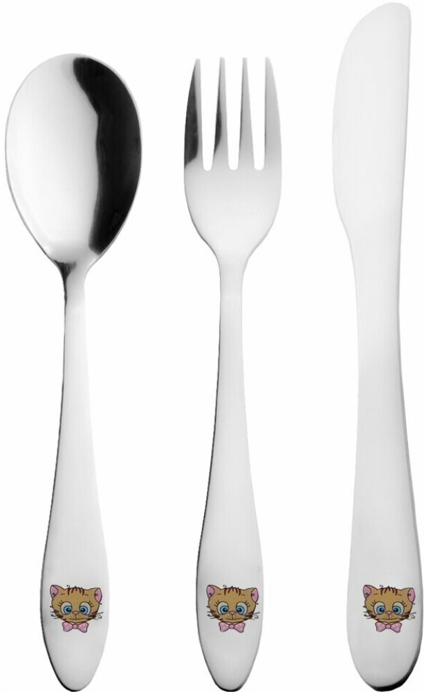 Příbory s motivem roztomilých kocourků s mašlí slouží pro nácvik správného stolování. Sada obsahuje lžíci délky 15,5 cm, vidličku 15 cm a nůž délky 17 cm. Svou velikostí a váhou jsou uzpůsobeny malým dětským ručkám.Přednosti dětských příborů:kvalitní celonerezové provedenímožnost mytí v myčceUpozornění: Příbor není hračka, je vhodný pro děti od 3 let. Lze mýt v myčce, ale s ohledem na barevný poti...