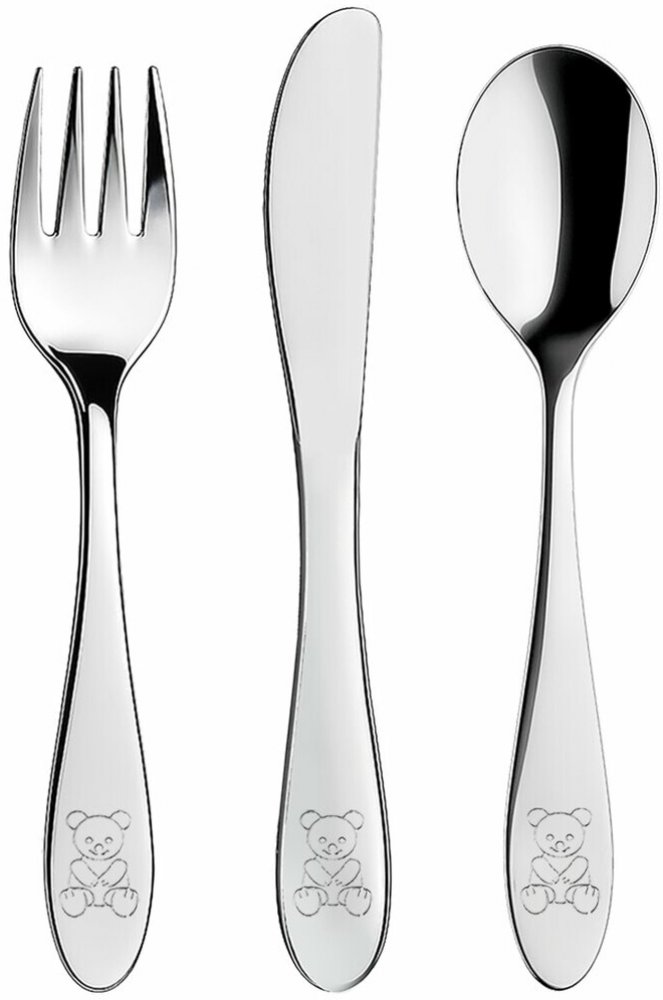 Dětský příbor s dekorem medvídka. Obsahuje 3 ks - lžíci, vidličku a nůž. Materiál: kvalitní nerez. Tvar přizpůsobený dětem. Lze mýt v myčce na nádobí. Rozměry: (délka/šířka) lžíce 15,5/3,5 cm, vidlička 15,5/2,5 cm, nůž 17/2 cm.