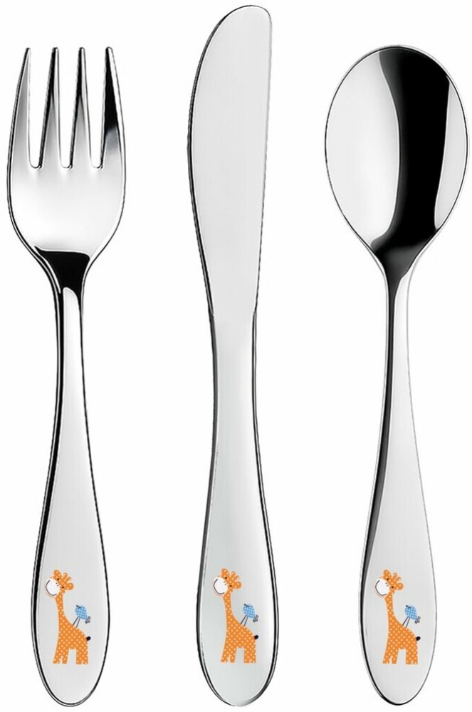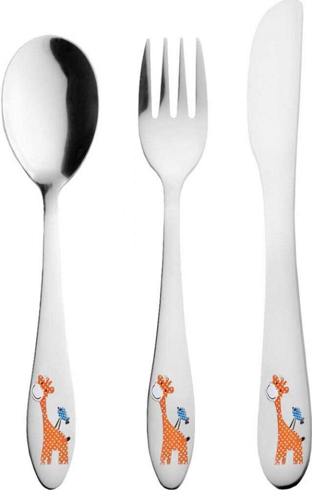 Dětský příbor s barevným dekorem žirafy. Obsahuje 3 ks - lžíci, vidličku a nůž. Materiál: kvalitní nerez. Tvar přizpůsobený dětem. Lze mýt v myčce na nádobí, ale nedoporučujeme, mohlo by dojít k porušení barevného dekoru, což později nemůže být důvodem reklamace. Rozměry: (délka/šířka) lžíce 15,5/3,5 cm, vidlička 15,5/2,5 cm, nůž 17/2 cm.