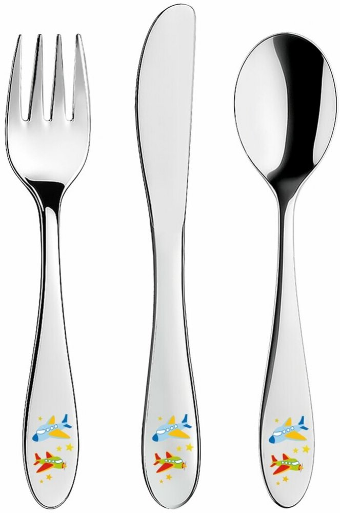 Dětský příbor s barevným dekorem letadel pro kluky. Obsahuje 3 ks - lžíci, vidličku a nůž. Materiál: kvalitní nerez. Tvar přizpůsobený dětem. Lze mýt v myčce na nádobí, ale nedoporučujeme, mohlo by dojít k porušení barevného dekoru, což později nemůže být důvodem reklamace. Rozměry: (délka/šířka) lžíce 15,5/3,5 cm, vidlička 15,5/2,5 cm, nůž 17/2 cm.