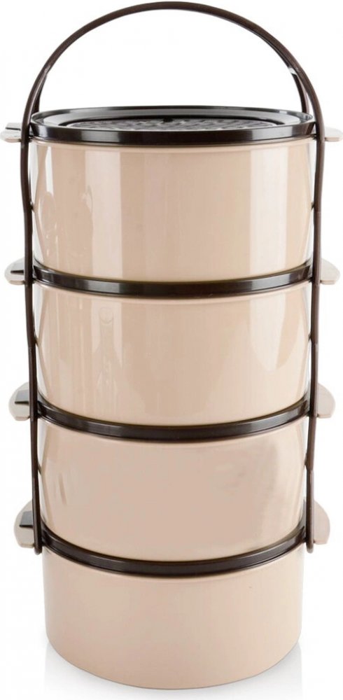 Praktická čtyřpatrová menážka na jídlo s objemem 4×1,5 l pro přehledné oddělení pokrmů. Má stohovatelné nádoby s víčky, pevný nosný rám s držadlem a odolné provedení v béžovo‑hnědé barvě. Vhodná do myčky, lednice, mrazáku a do mikrovlnky bez víka.