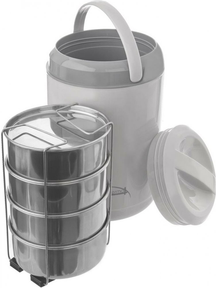 Termonádoba s nerezovým jídlonosičem obsahuje 4 nerezové misky s víčky, objem každé misky 0,8 l. Jídlonosič je uložen v plastovém termoobalu s víčkem na závit a se sklápěcím uchem, takže přenášený pokrm udrží dlouho svoji teplotu. Navíc pokrmům zajistíte dostatečnou hygienu zejména při jejich převozu hromadnými prostředky. Termonádobu lze použít také samostatně bez jídlonosičů na uchování i přenášení potravin. Do myčky na nádobí jsou vhodné jen nerezové jídlonosiče. Jídlonosiče slouží na uchování potravin, jsou vhodné do chladničky, není možné v nich jídlo ohřívat.