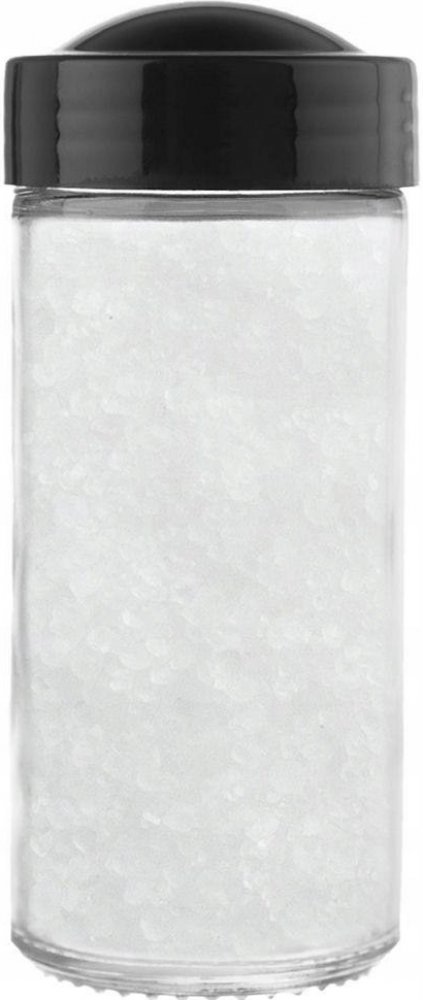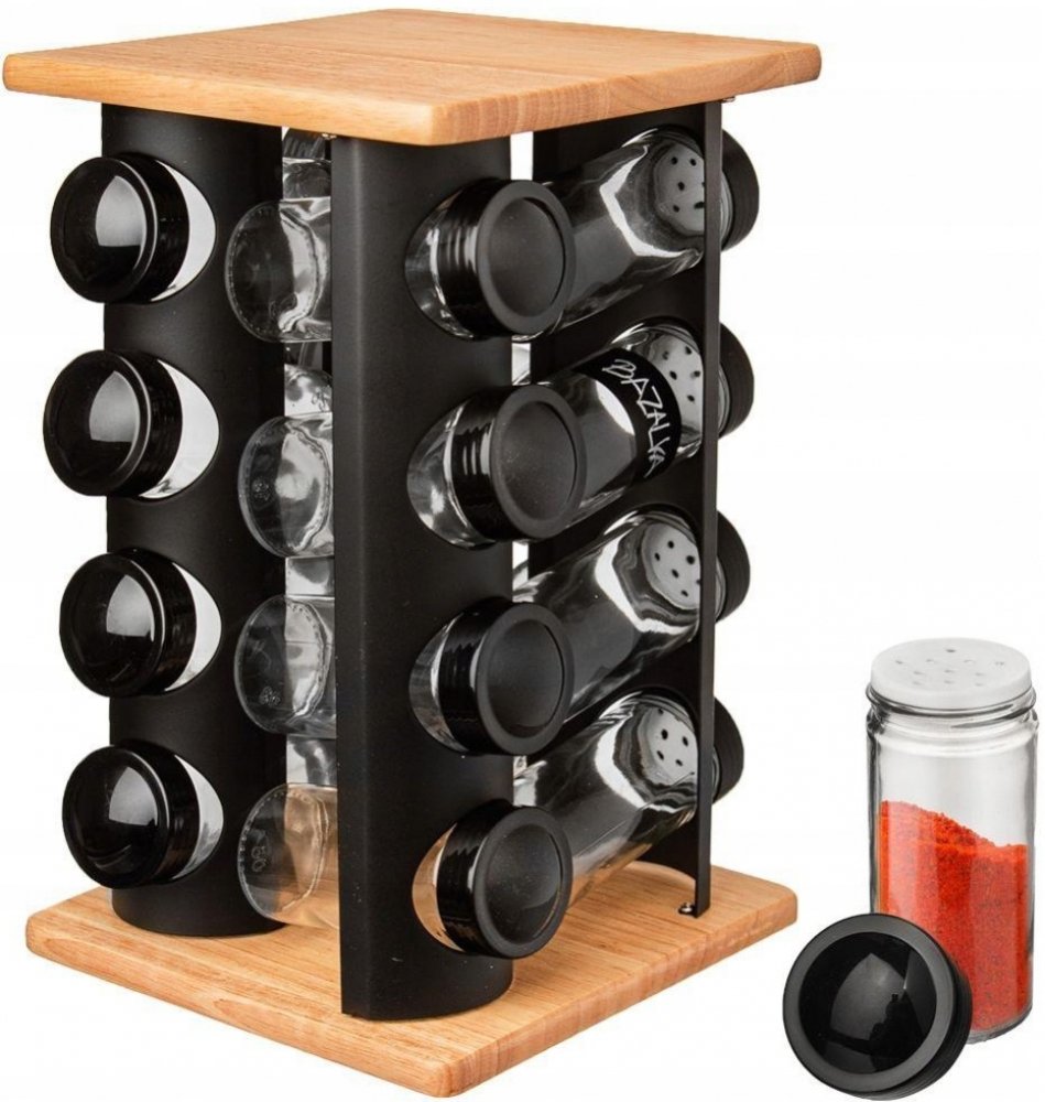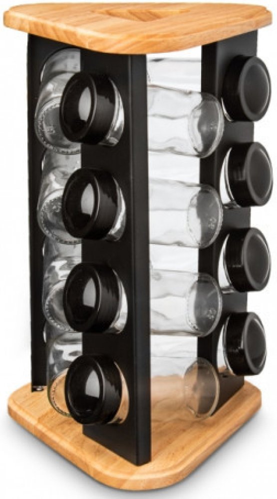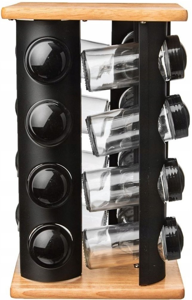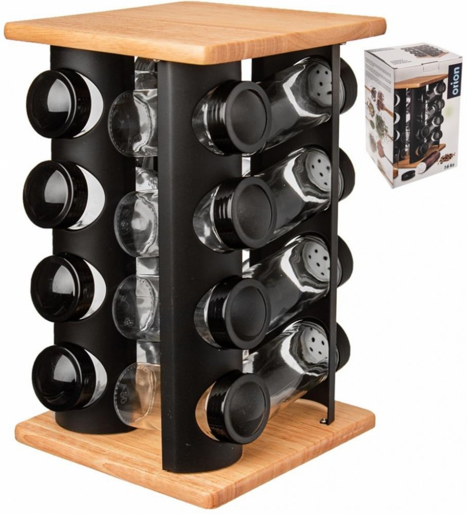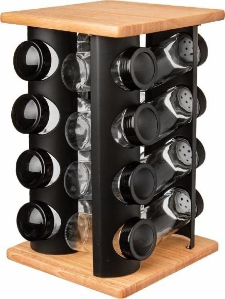 Designový otočný dřevěný stojan s černými nerezovými lištami s otvory, jehož součástí je 16 kusů skleněných kořenek průměru 4,5 cm a výšky 10 cm. Každá má plastové sypátko a černé víčko. Podle vloženého koření nebo dochucovadla tak můžete sypátko ponechat nebo jej odděláte a pohodlně nasypete a vysypete větší kousky, např. nové koření, hřebíček.