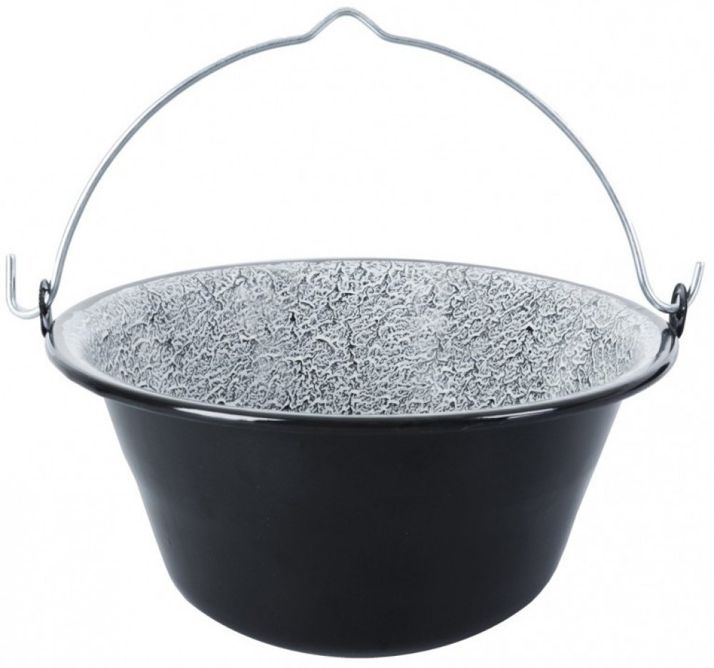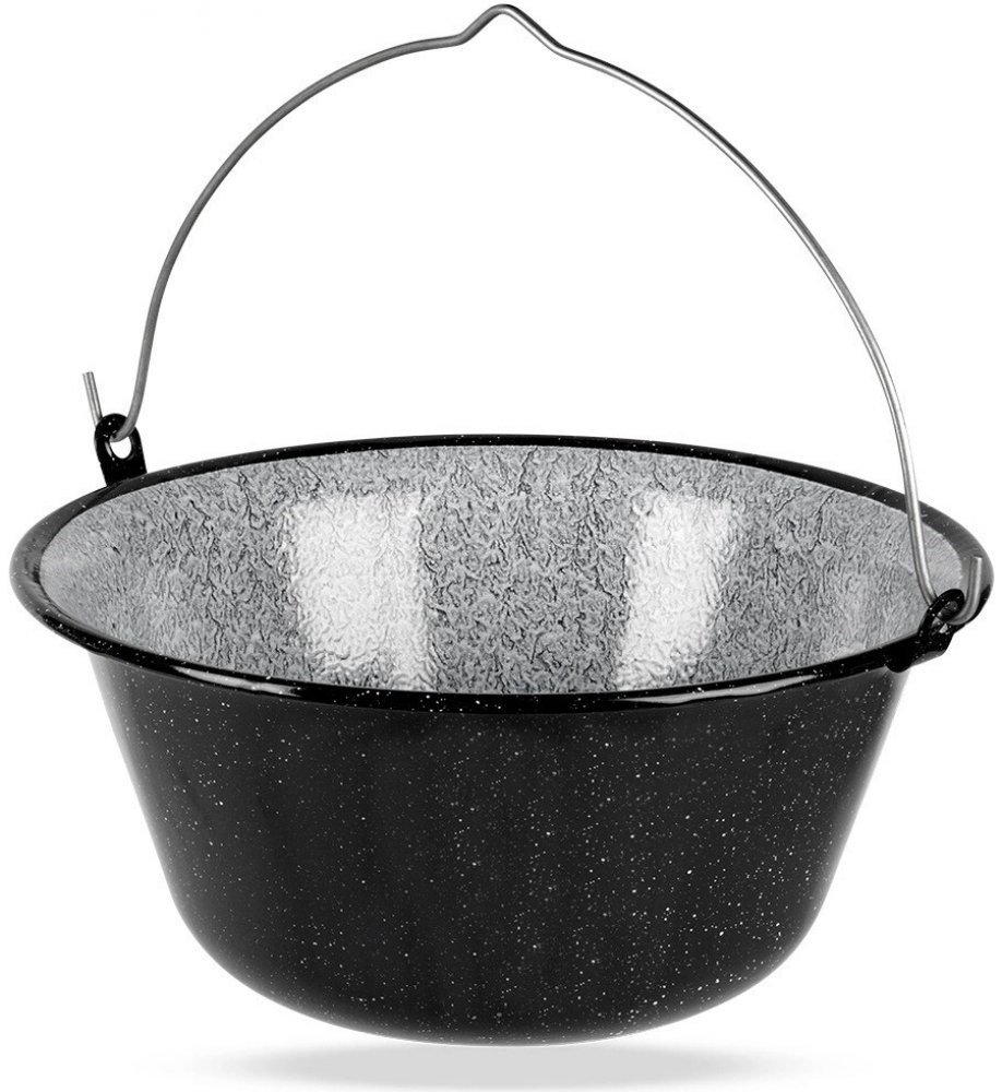 Kotlík má ocelový základ pokrytý smaltem, což je tavenina podobná sklu a vytvoří tak odolný, zcela zdravotně nezávadný povrch. Lze jej zavěsit buď na samostatně prodávanou trojnožku (111056) nebo ho postavit na rošt nad ohněm.
