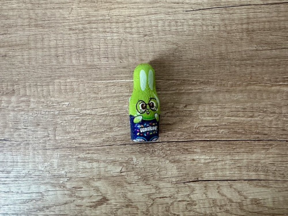 Velikonoční dutá figurka z mléčné čokolády s mléčnou čokoládou dražovanou v cukernaté krustě uvnitř zajíčka.