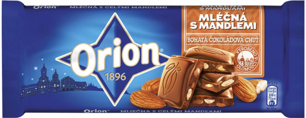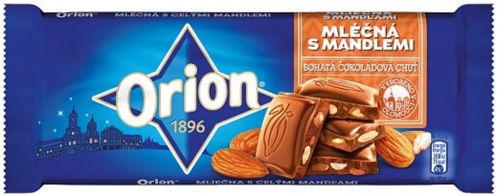 Mléčná čokoláda s celými mandlemi.Objevte lahodnou chuť celých křupavých mandlí zalitých v mléčné čokoládě ORION. Tu pro vás vyrábíme podle naší receptury tradičně bohaté na kakao, která jí dává její nezaměnitelnou bohatě čokoládovou chuť a sametovou konzistenci.ORION. Bohatá čokoládová chuť., www.orioncokolada.czwww.facebook.com/ORION, Mléčná čokoláda 83 % s celými mandlemi 17 %., Balení obsahuje...