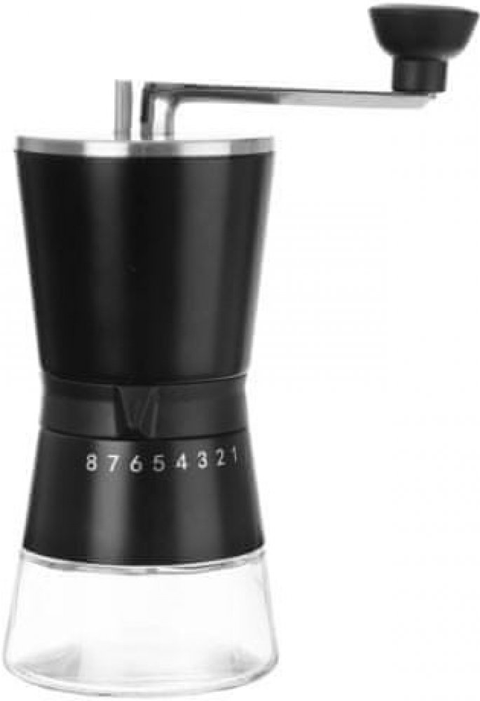 Ruční nerezový mlýnek na kávu v černé barvě těla čerstvě namele zrnkovou kávu. Taková káva bude jiný level než balená mletá káva.