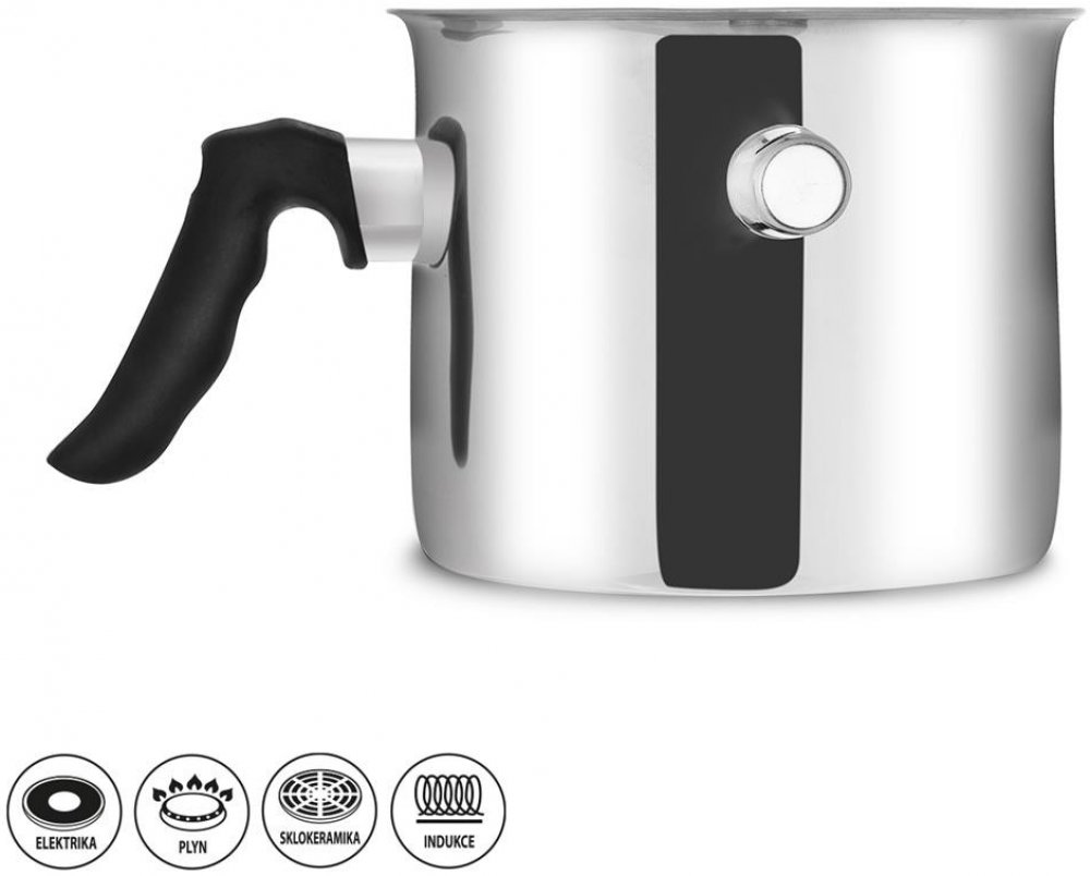 Nerezový mlékovar s dvojitou stěnou - mezi stěny nalijete vodu, která brání připálení mléka i různých omáček. Tvarované plastové držadlo a píšťalka, která upozorní na vařící se vodu. Vhodný na všechny typy tepelných spotřebičů včetně indukce.